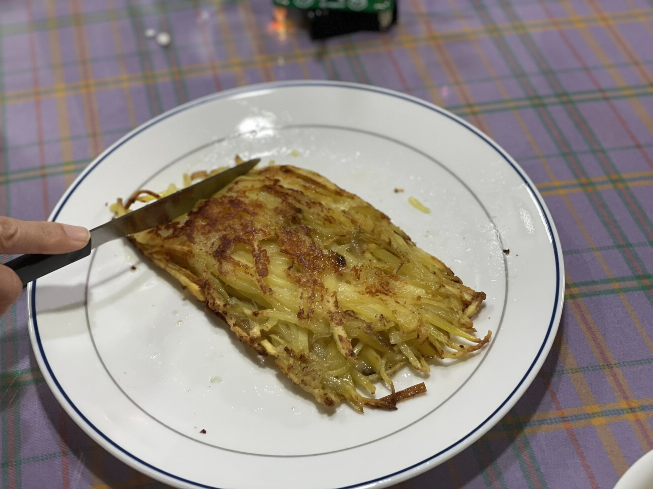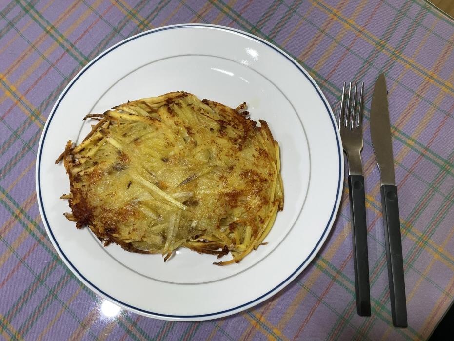프라이팬에 식용유를 넉넉히 두르고 전분물이 굳었으면 손으로 풀어주면서 전분물 묻은 고구마채를 프라이팬에 한 움큼 펴서 올려놓습니다. 옆으로 빠져나온 고구마채를 정리하여 동그란 전 모양으로 만듭니다.