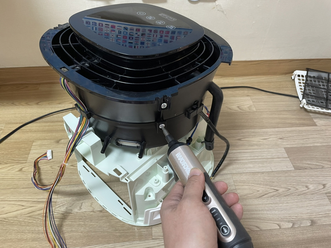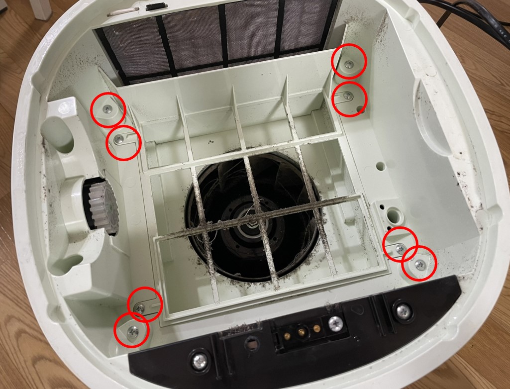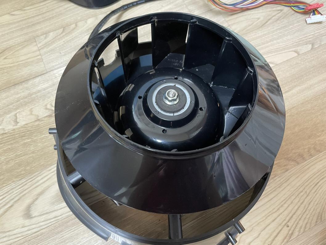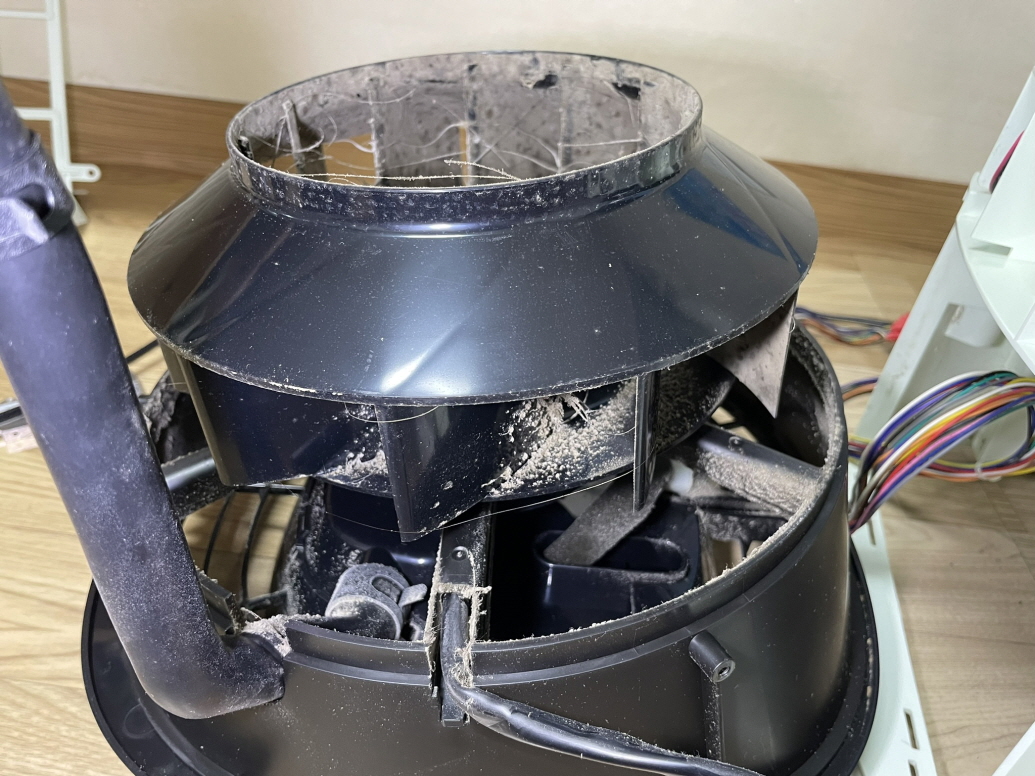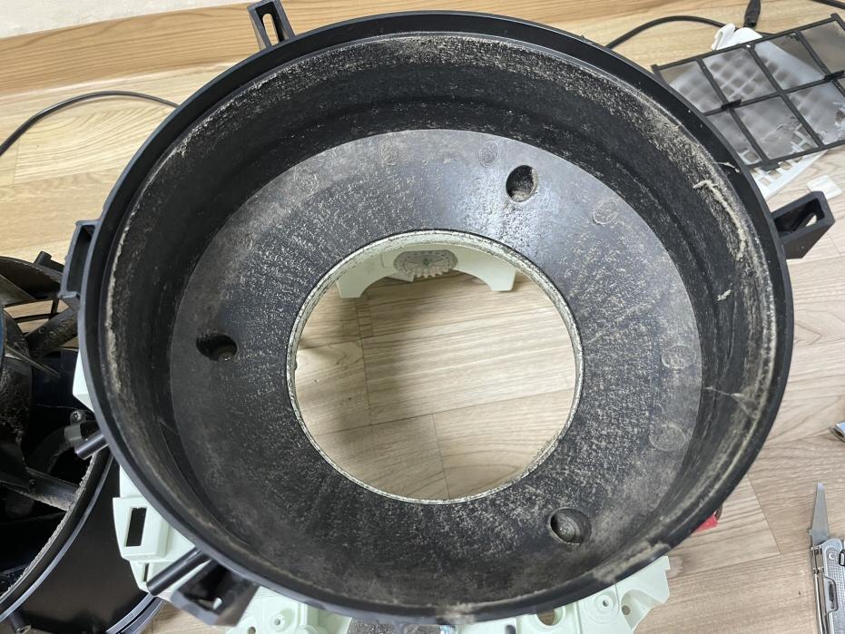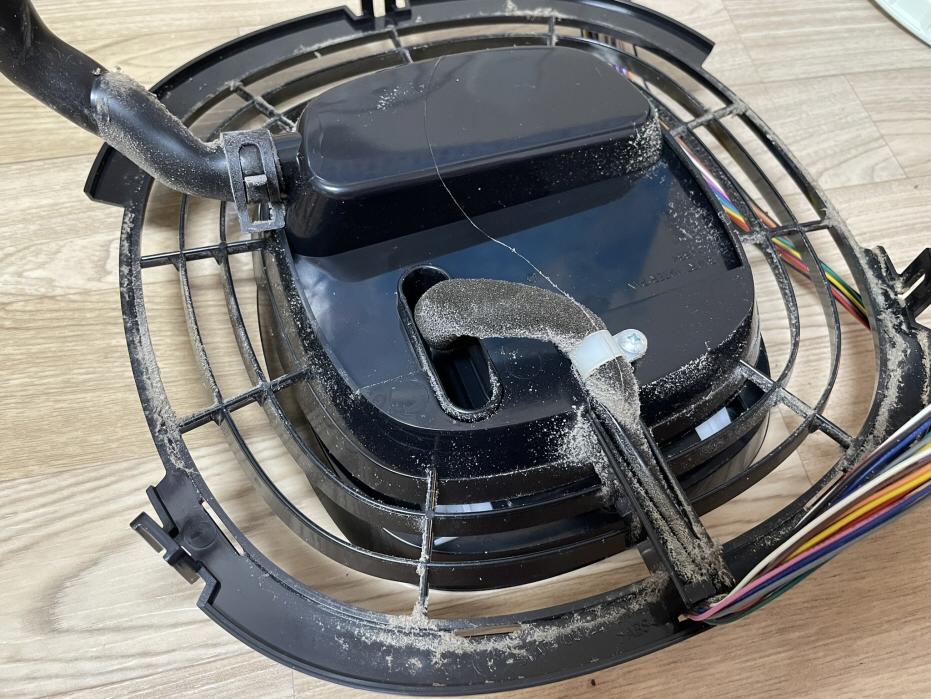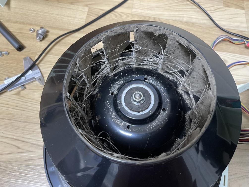 그 아래 팬에 머리카락과 먼지가 많이 껴 있어요. 모든 피스 볼트를 제거하였으면 덮개와 분리됩니다.