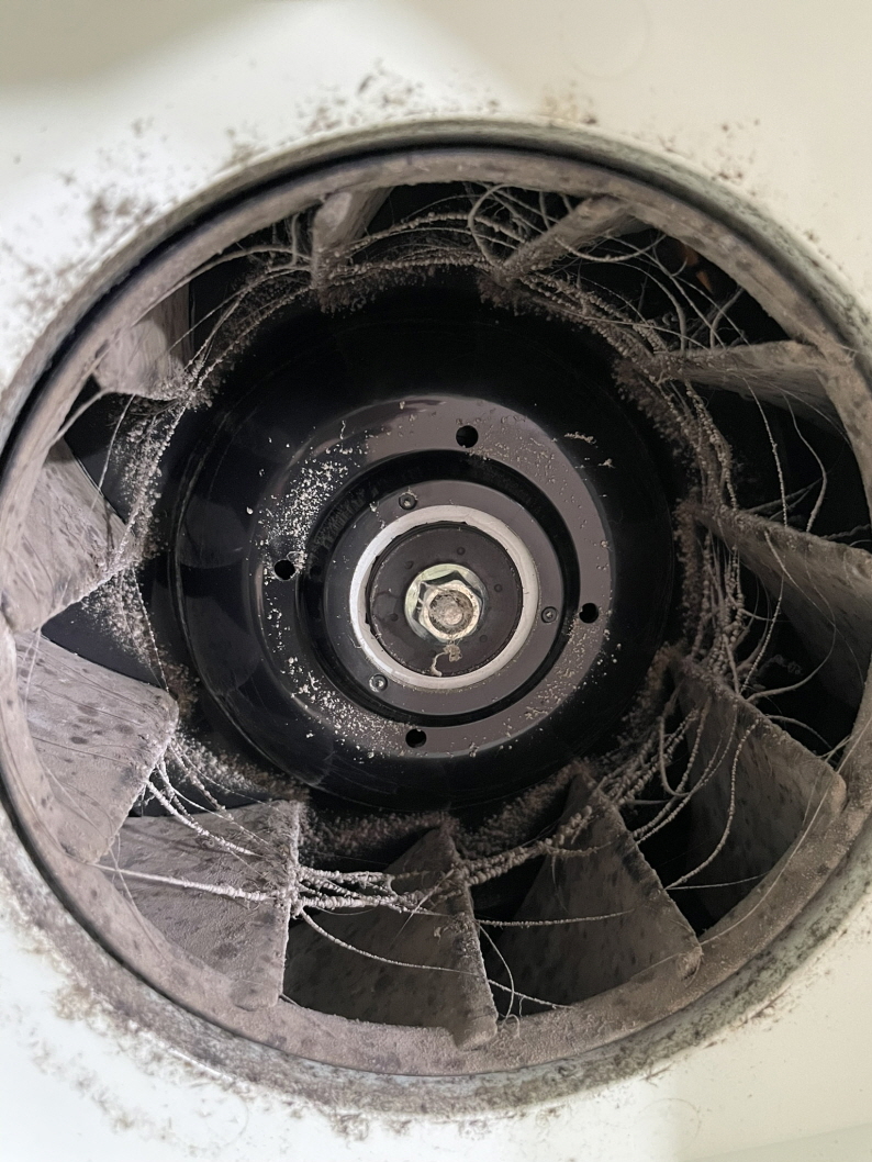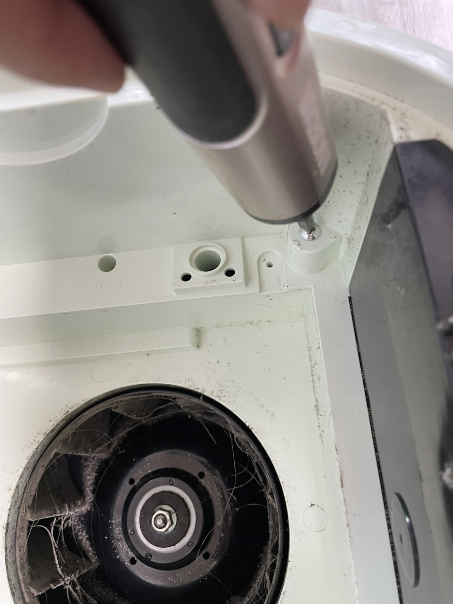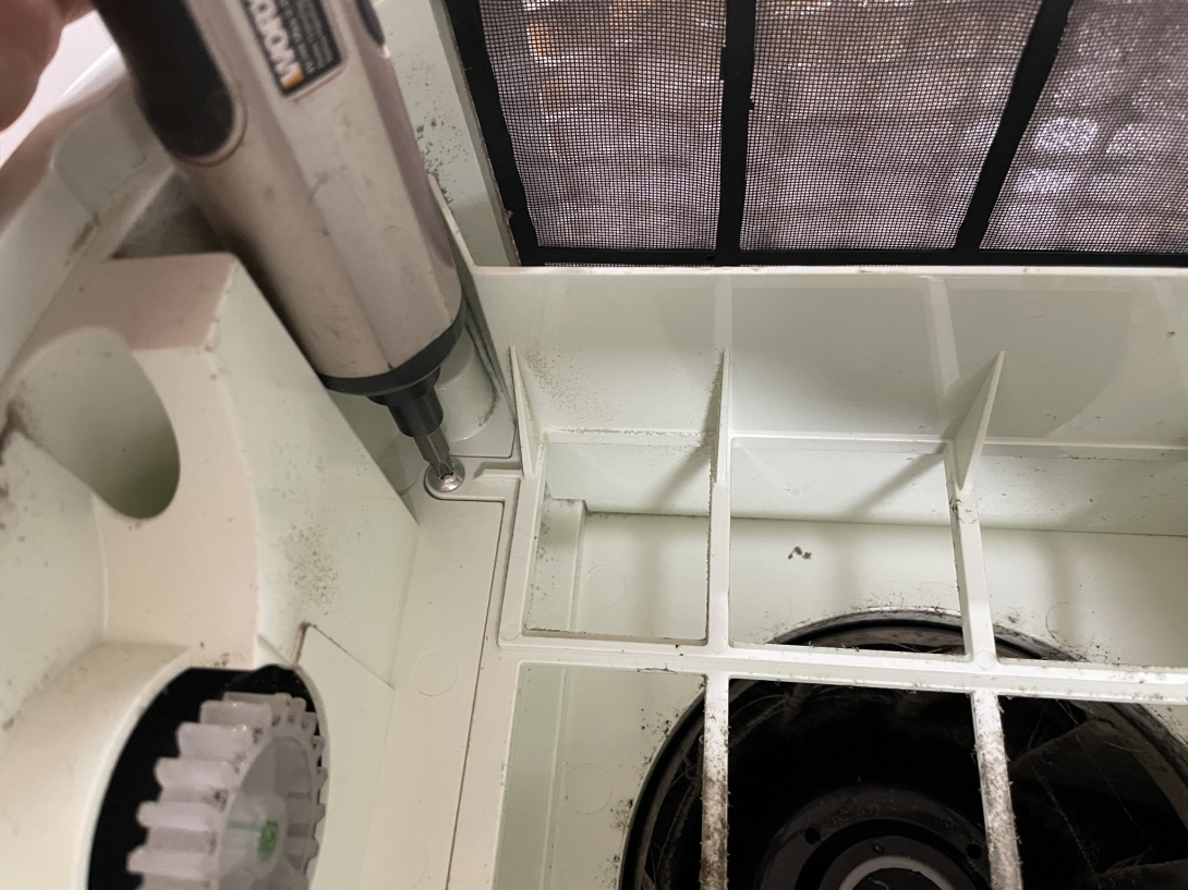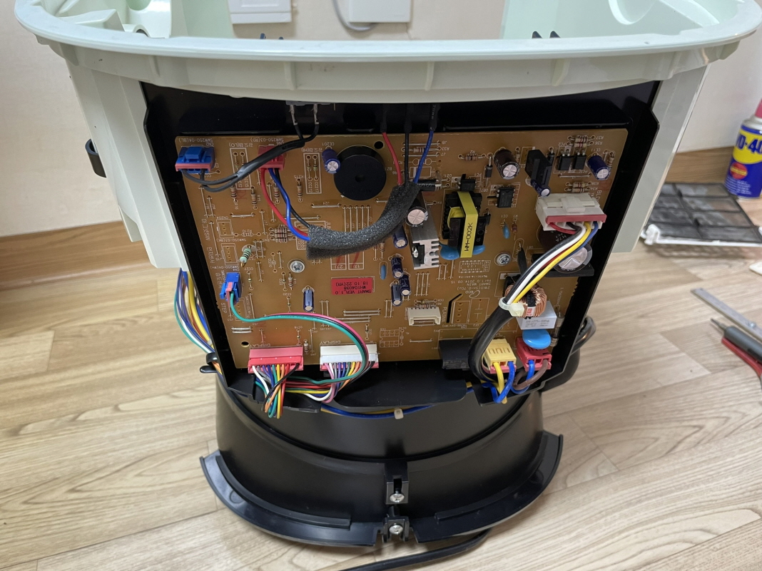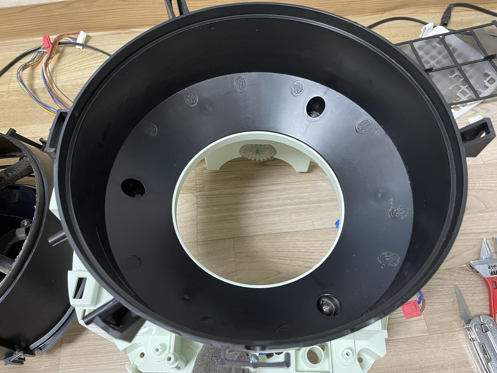 그 아래 팬에 머리카락과 먼지가 많이 껴 있어요. 모든 피스 볼트를 제거하였으면 덮개와 분리됩니다.