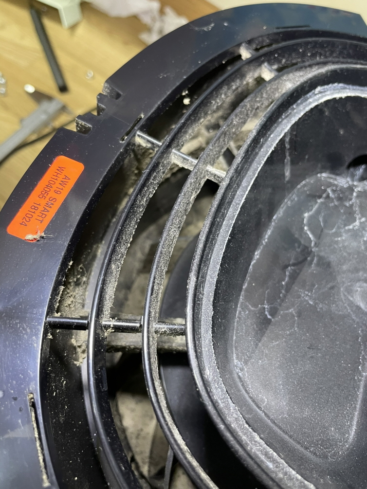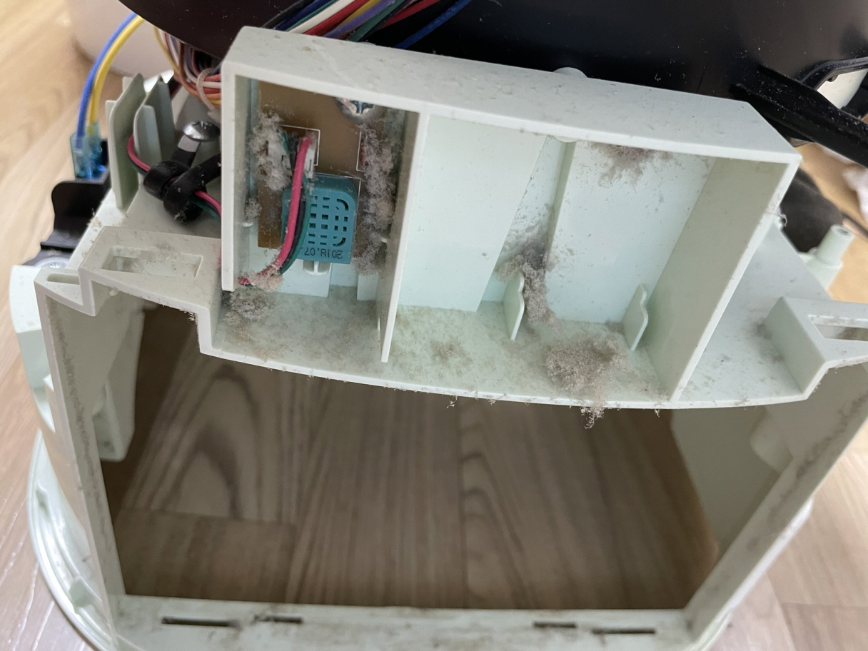 하단의 물통과 분리하여 상단 본체를 뒤집습니다. 먼지가 많이 껴 있는 것을 볼 수 있습니다.