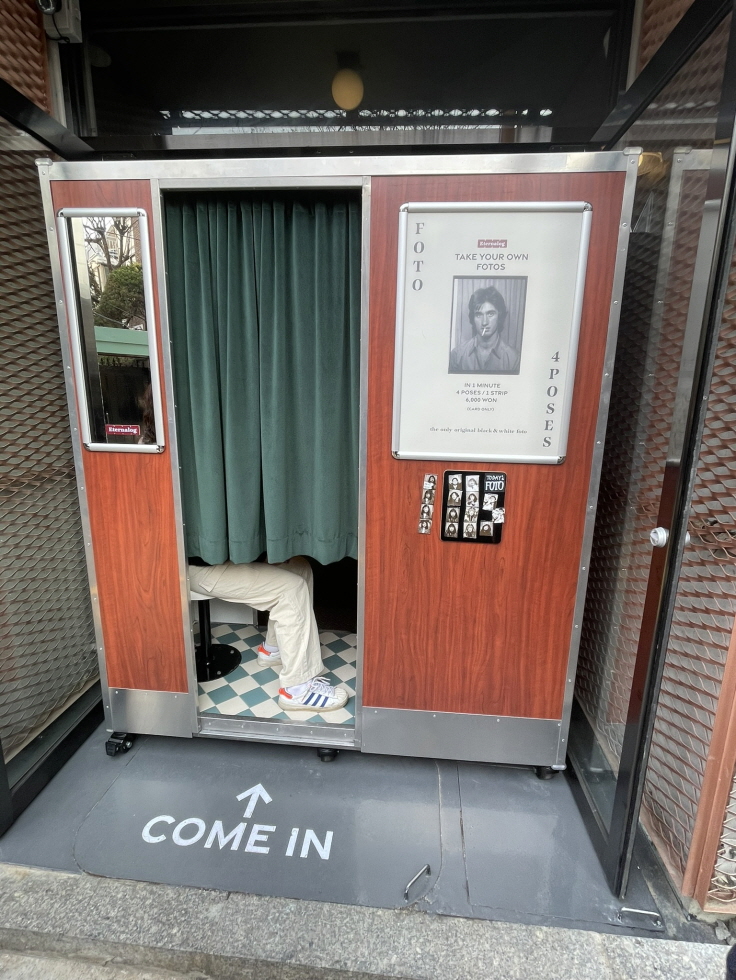이터널로그 이터널로그는 유럽에서 1960년대 사용하던 아날로그 사진 부스를 갖고 와서 복원한 흑백사진 촬영 장소입니다. 흑백 옛날 사진으로 찍는 스티커 사진 같은 거예요. 요즘 젊은 사람들