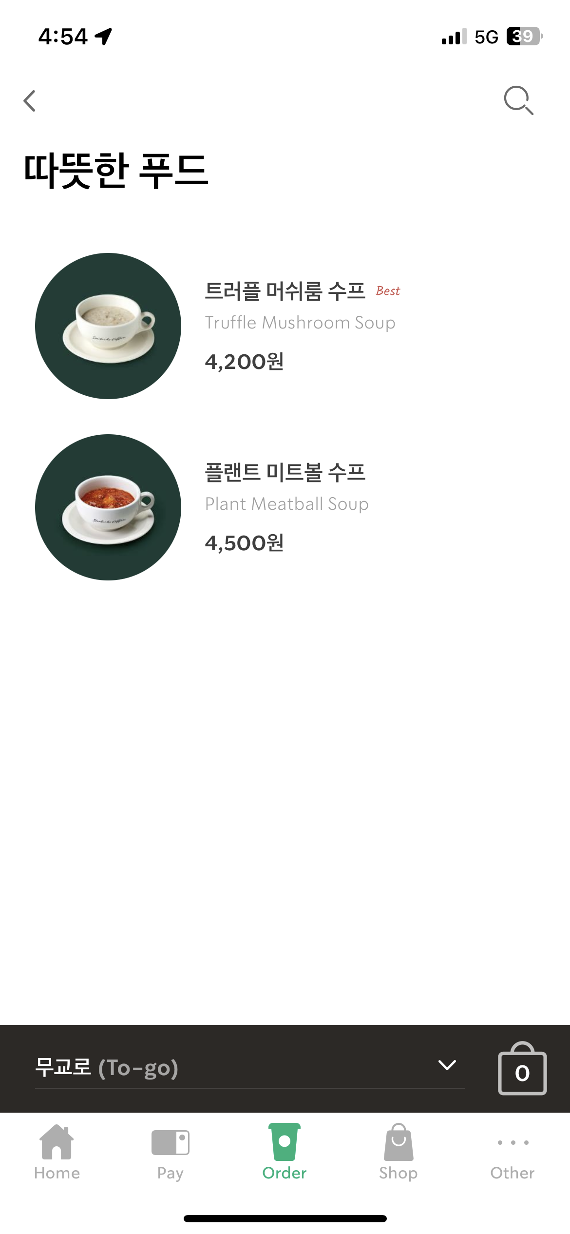 스타벅스 푸드 메뉴 중 트러플 머쉬룸 수프가 있습니다.