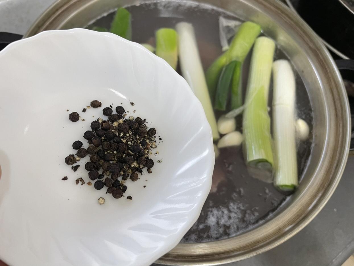 3. 대파를 크게 썰어 넣고 통마늘, 생강, 통후추, 양파를 넣어 1시간 30분 정도 끓입니다. 거품이 생기면 거품만 걷어냅니다.