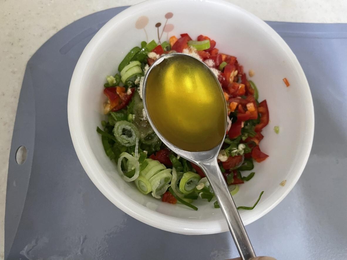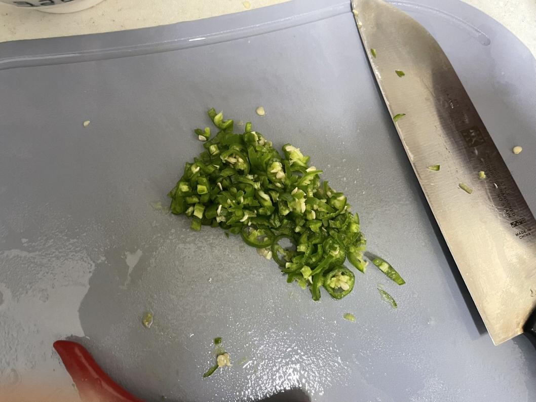 1. 송송 썰은 대파와 홍고추, 청양고추를 작게 썰어서 그릇에 담아요.