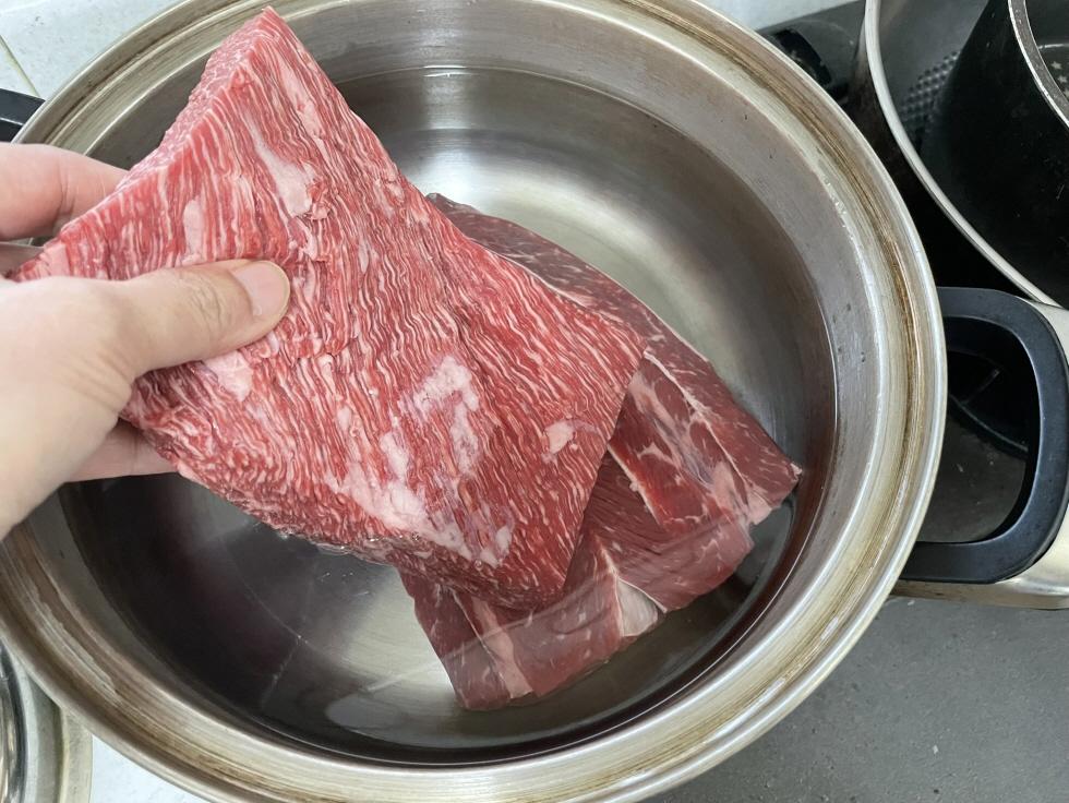 2. 3리터의 물에 양지, 아롱사태를 넣고 끓입니다.
