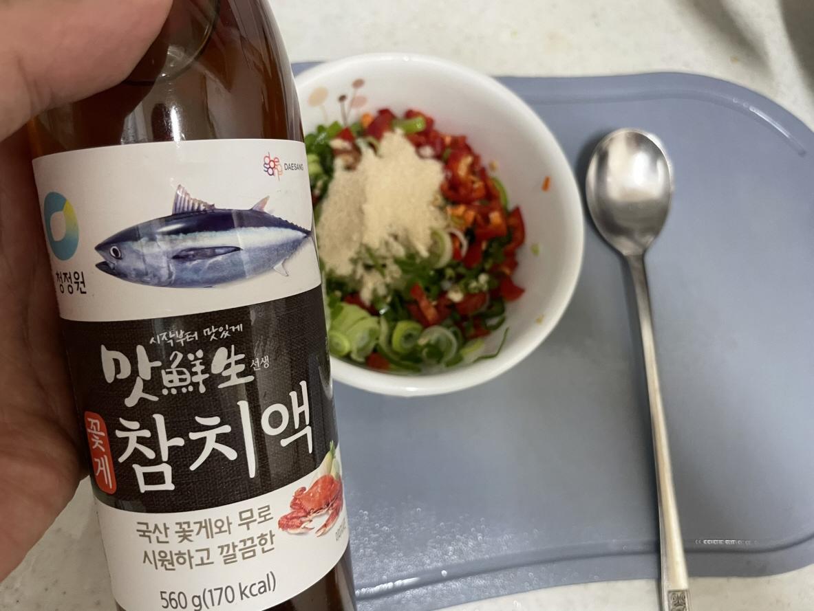 2. 후추, 설탕, 참치액, 고춧가루, 들기름을 넣어요.