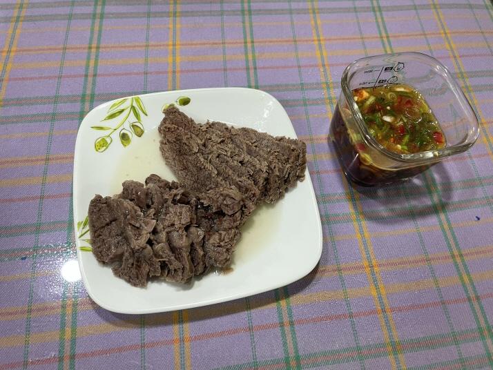 4. 고기를 건져내어 고기결의 반대 방향으로 얇게 썰어 접시에 담습니다. 그래야 고기가 부드럽고 맛있어요. 육수를 약간 고기 위에 뿌려서 고기를 먹는 동안 촉촉한 상태로 유지합니다.