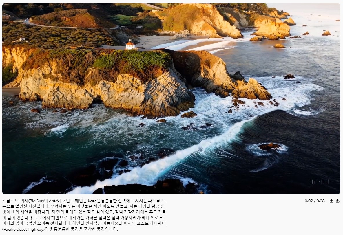 대단하네요. 정말 사실적으로 영상을 묘사하였습니다. 카메라로 실제로 찍은 듯한 높은 퀄리티를 보여줍니다. 이런 모든 화면을 AI가 만들었다는 게 놀랍죠.