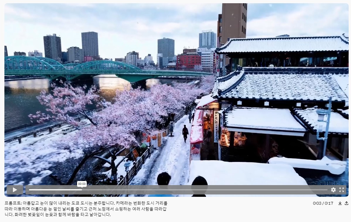 이런 현실적이지 않은 영상도 만들어 줍니다. 눈 내린 거리에 벚꽃이 피어 있네요.