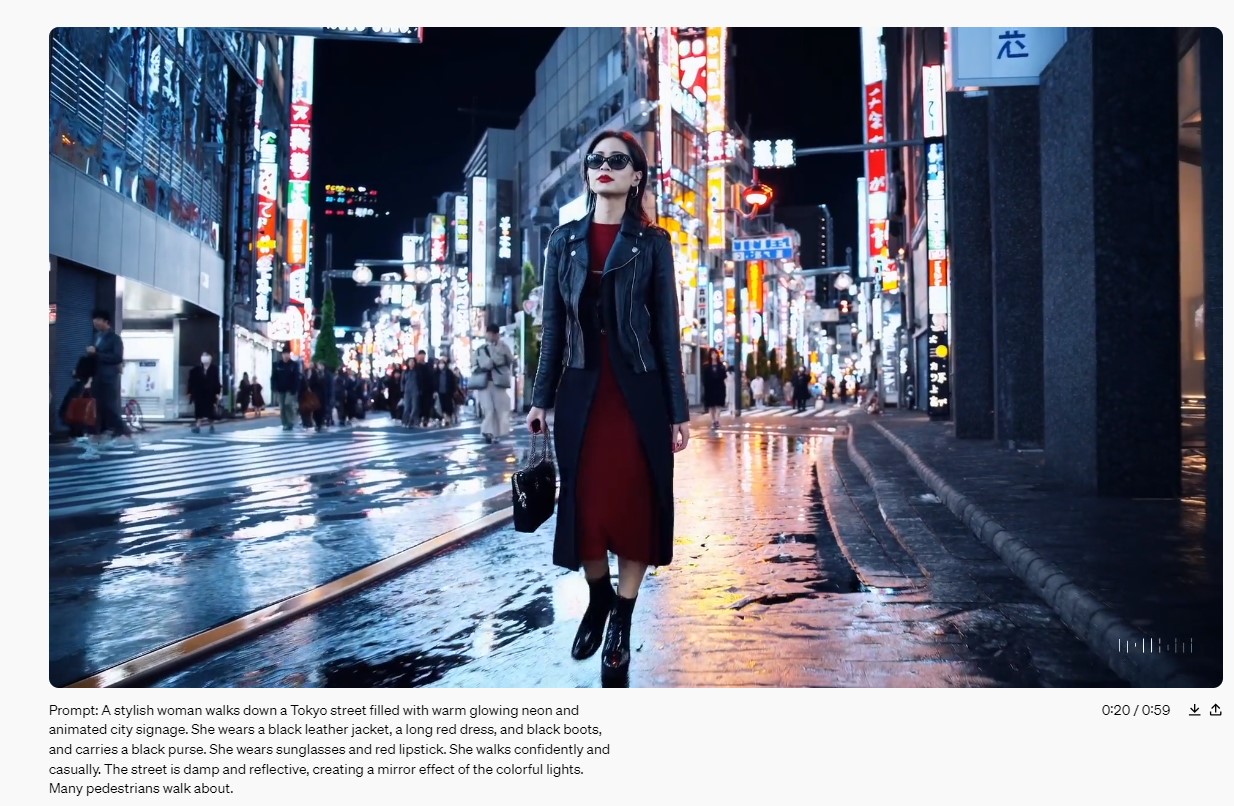 도쿄거리를 걷고 있는 세련된 여성이 검은색 가죽 재킷, 빨간색 드레스, 검은색 부츠를 신고 있다는 내용의 텍스트를 입력하여 얻은 동영상입니다.