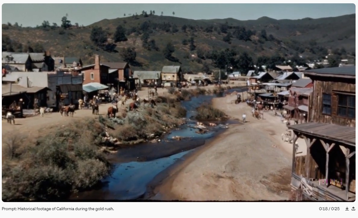 이 영상은 골드러시 시절의 캘리포니아의 역사적 영상입니다. 영화의 한 장면 같습니다. 미국 서부영화를 보는 것 같은 느낌이네요. AI가 만들었지만 드론으로 촬영한 듯한 영상을 표현하였네요.
