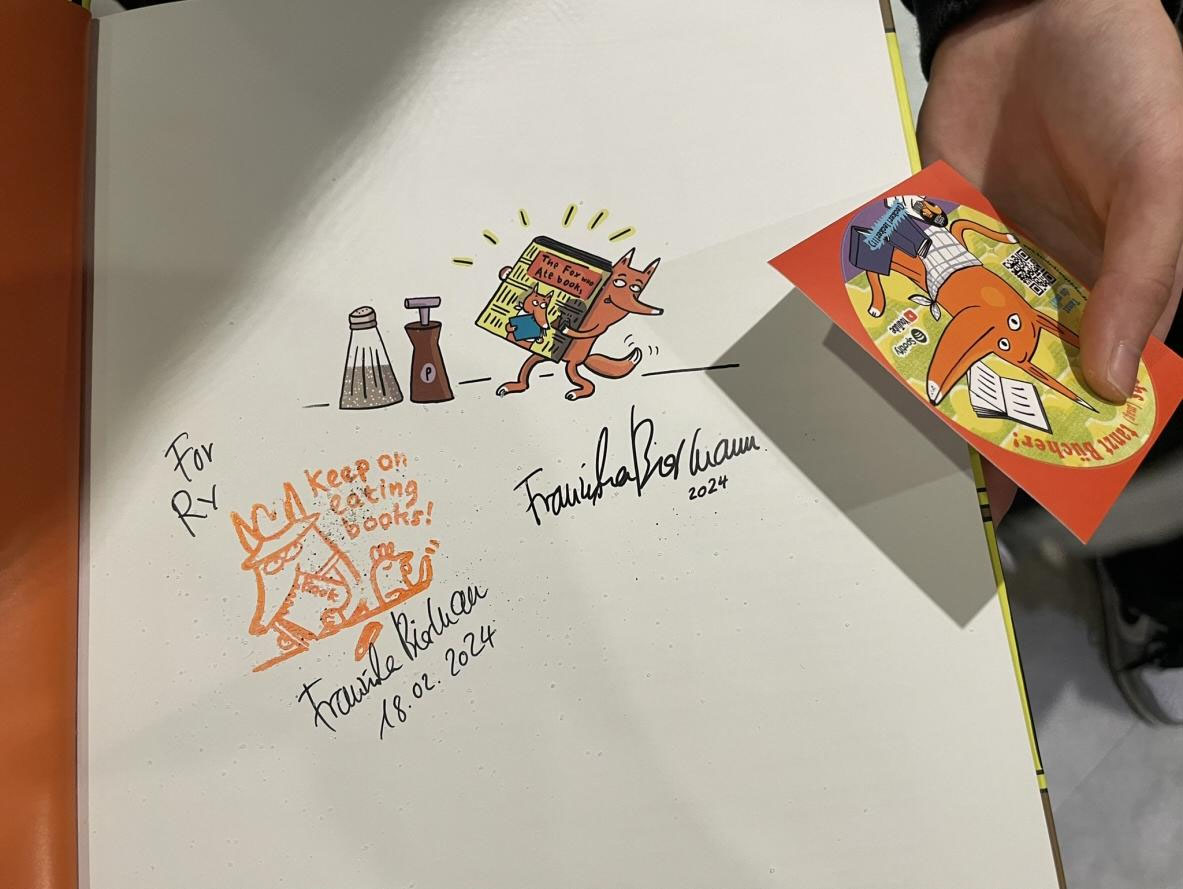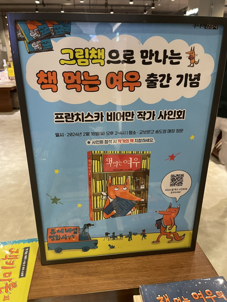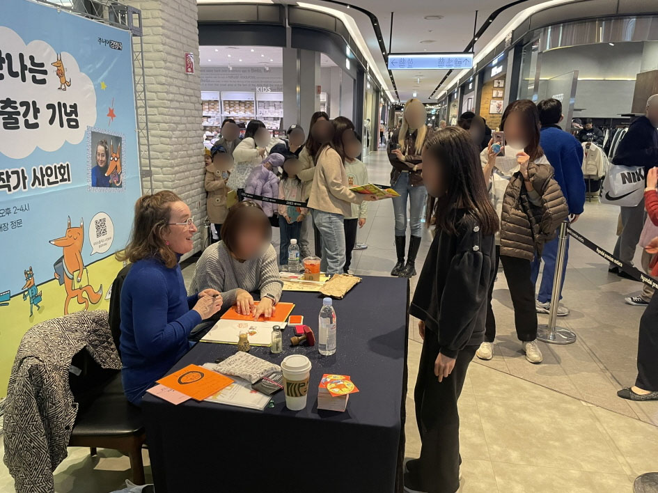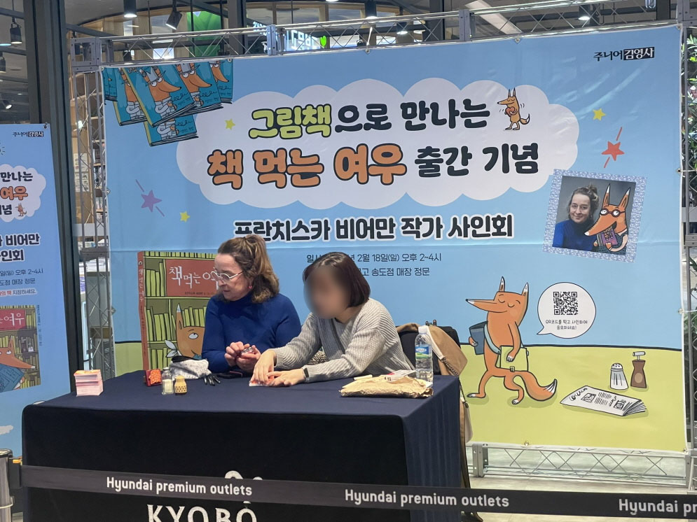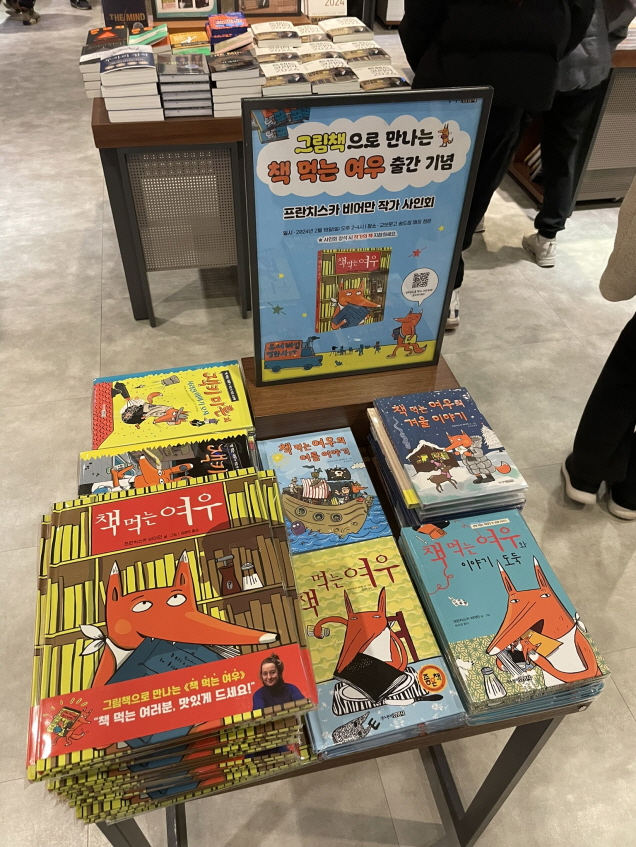 프란치스카 비어만 작가님은 글과 그림을 직접 그리시는데요 ‘책 먹는 여우’는 2001년에 처음 출간했어요. 이번에 그림책으로 만나는 책 먹는 여우를 새로 출간했는데요. 그 기념으로 대한민국에 오셔서 사인회를 진행했습니다.