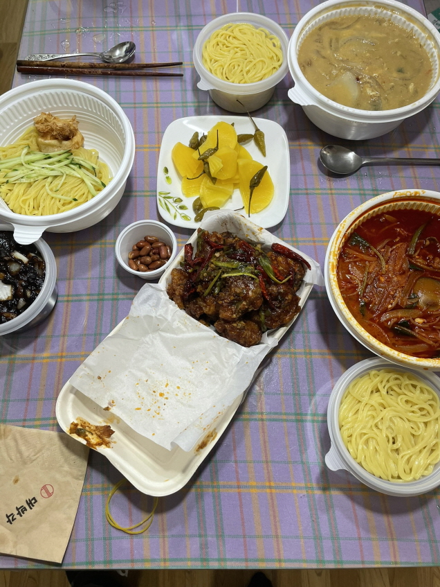 삼선갓짜장, 찐소고기짬뽕, 용대리 황태 백짬뽕, 깐풍기(소) 이렇게 사 왔어요.