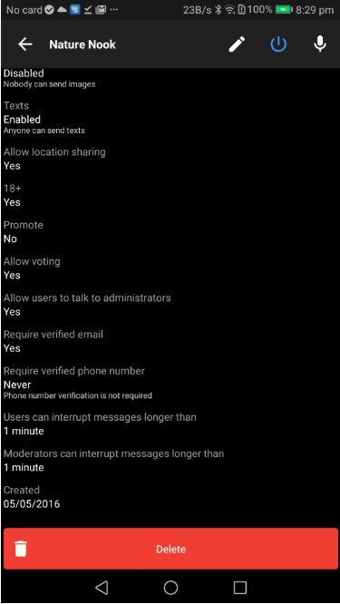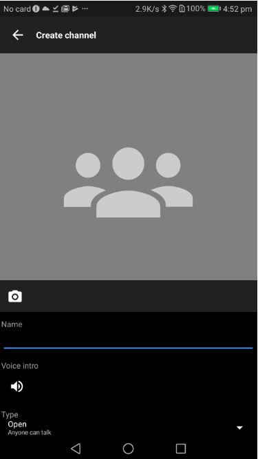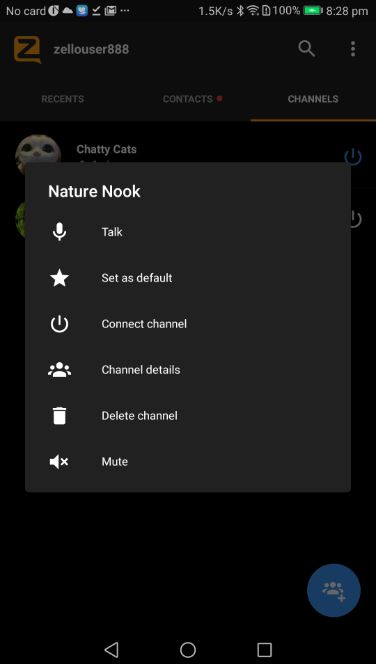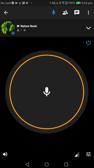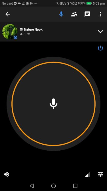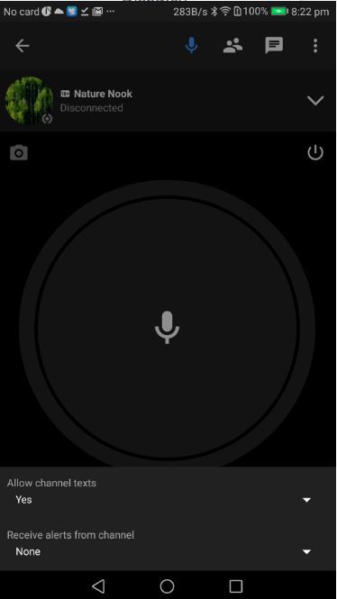채널에서 대화하려면 연결되었는지 확인한 다음(전원 아이콘이 파란색임) 대화하려면 빨간색으로 켜질 때까지 큰 버튼을 길게 누르십시오. 아무도 말을 하려고 하지 않는 한, 당신이 원하는 만큼 말을 할 수 있다. 다른 사용자가 대화를 시도하는 경우, 중단 전의 통화 시간은 채널 프로필의 소유자에 의해 설정됩니다(1초에서 10분).