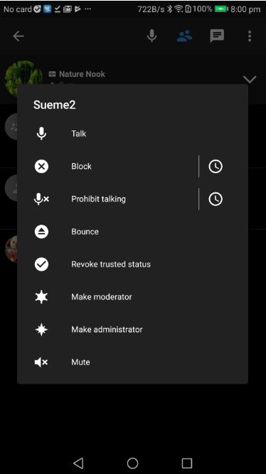 사용자가 채널에 메시지를 보낸 경우 사용자 이름을 길게 누르면 차단, 통화 금지, 바운스, 신뢰 상태 취소, 진행자 만들기, 관리자 만들기 또는 음소거 옵션이 표시됩니다.