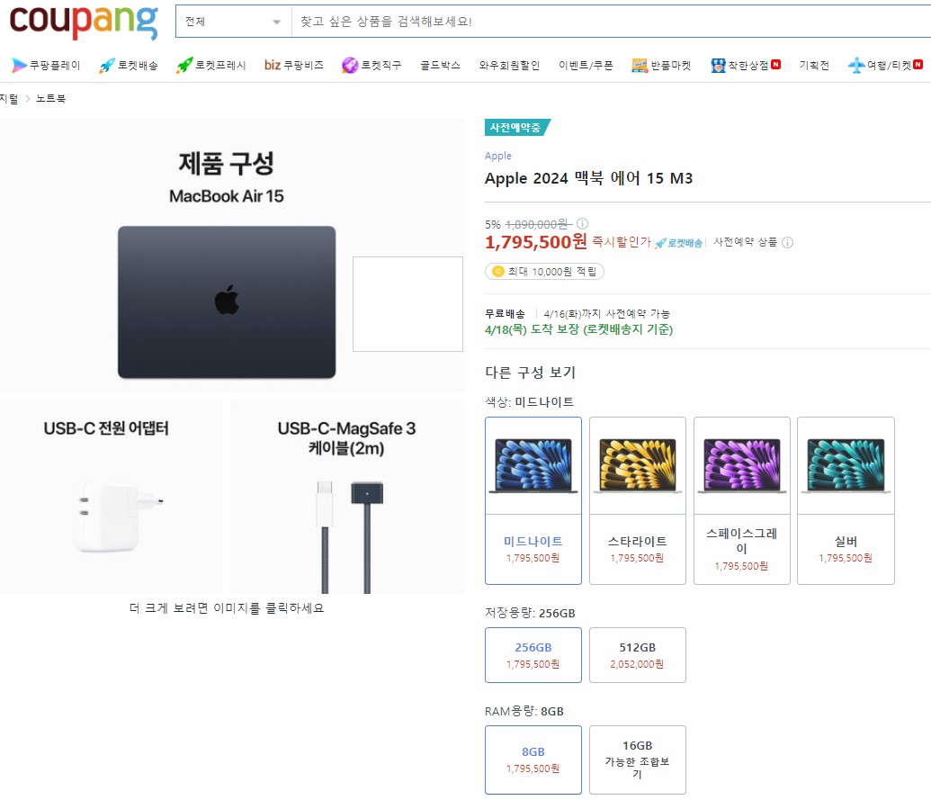 M3 맥북에어가 사전 예약을 시작했습니다. 예상했던 대로 417일부터 배송이 시작되네요.