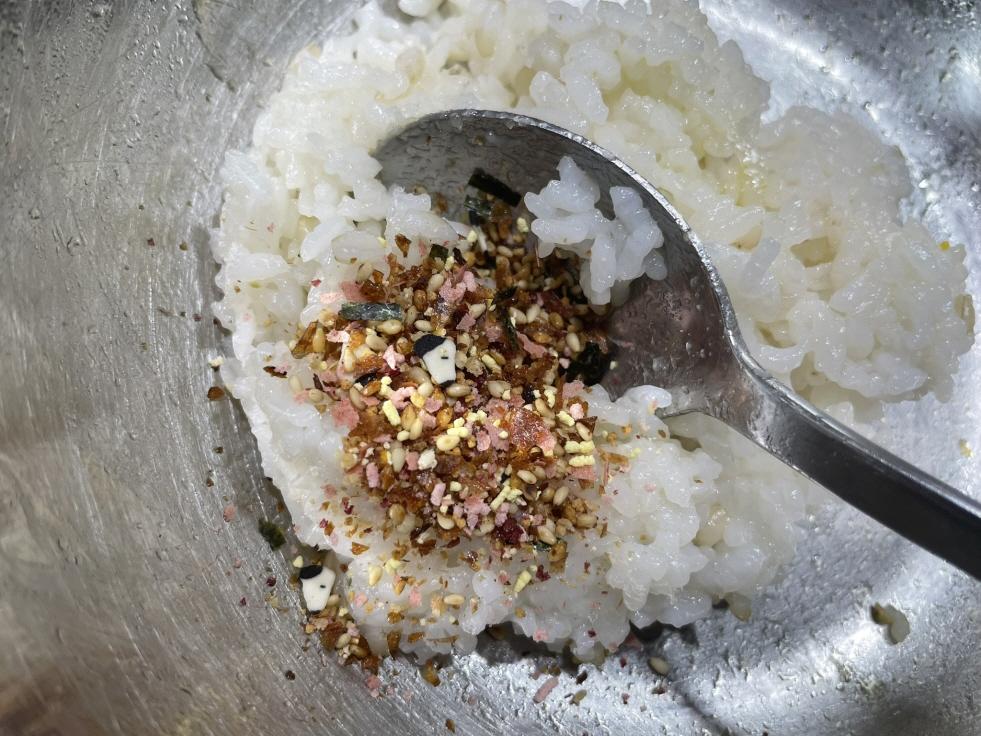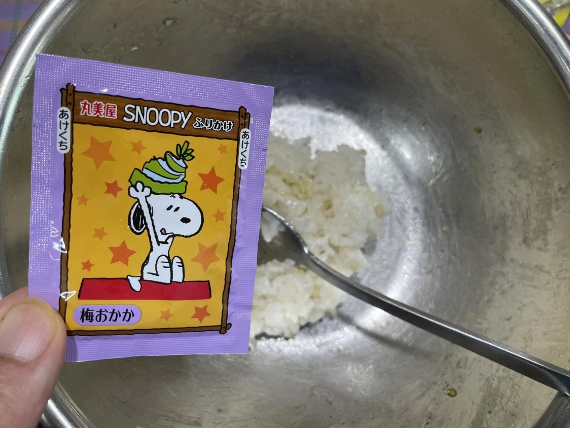 1 뜨거운 밥에 스누피 후리카케와 들기름 몇 방울 넣고 비벼줍니다. (스누피 플레이크가 귀엽네요)