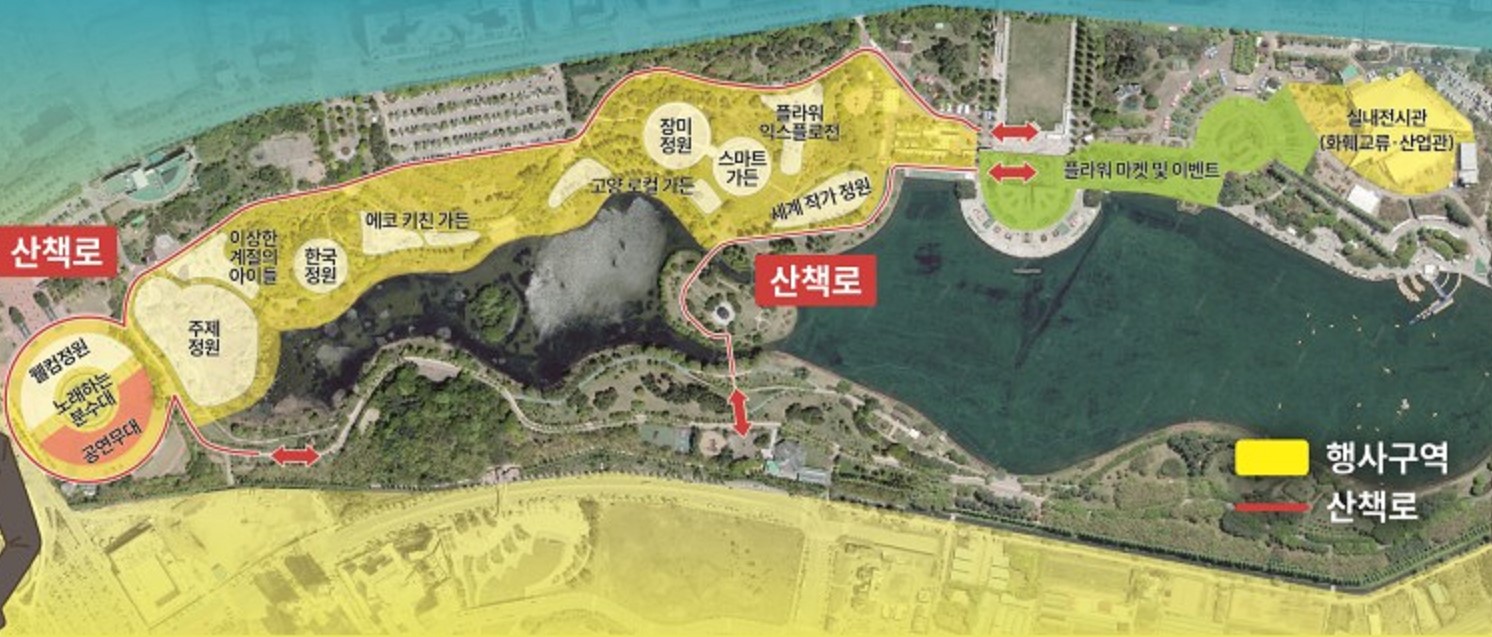 꽃박람회 기간동안 호수공원 일부 구역의 통행이 제한되어 아래 안내도의 산책로를 이용해야 합니다. 많은 사람이 찾아오기 때문에 질서 있는 행사운영을 위한 안내인 것 같아요.