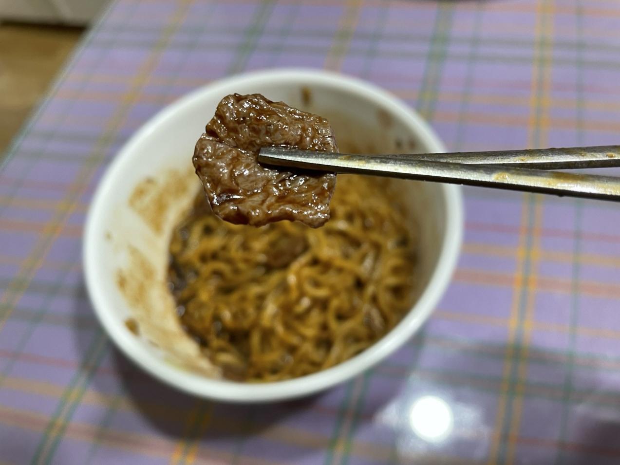 건더기는 기존보다 훨씬 커졌어요. 조리예의 사진을 보면 건더기가 풍부해 보이지만 이 정도는 아니고요. 건더기 스프 중 고기가 커졌어요. 고기는 실제 고기가 아니고 콩고기입니다. 맛은 쫄깃하고 맛있네요.