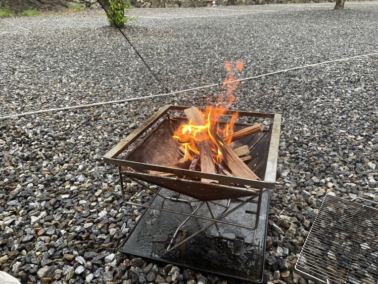 여기서 구매한 장작은 바싹 말라 있어서 비 오는 날에도 불이 잘 붙어요. 토치로 조금만 불붙였는데도 활활 타네요. 장작은 2망 구매해서 잘 때까지 태웠어요.