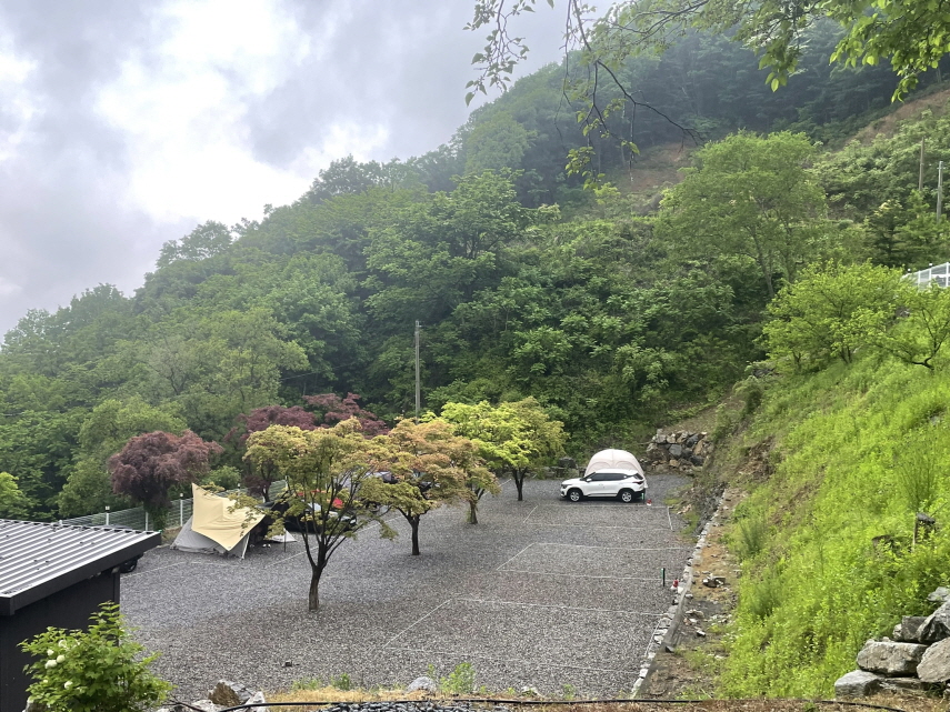 캠핑장 진입로가 산길입니다. 골목입구부터 약 4km 정도를 산길로 올라와야 해요. 운전이 어렵지는 않아요.
