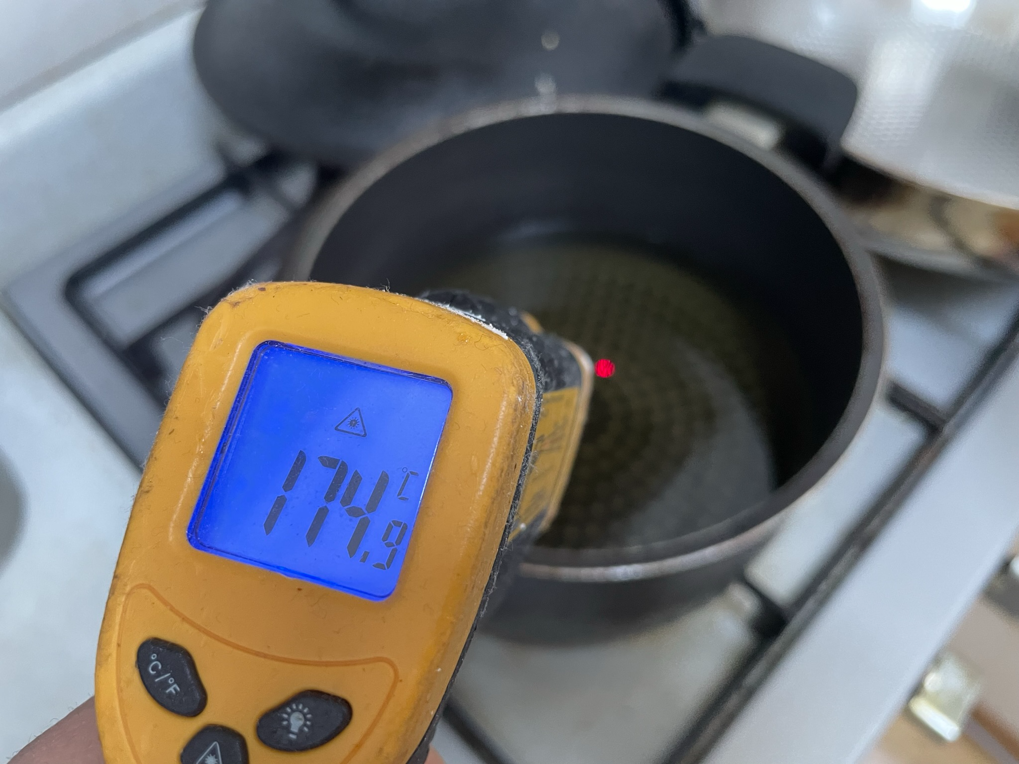 8. 기름온도는 170도를 유지할수 있도록 수시로 온도체크 합니다.(그래야 고기가 타지 않고 잘 익어요)