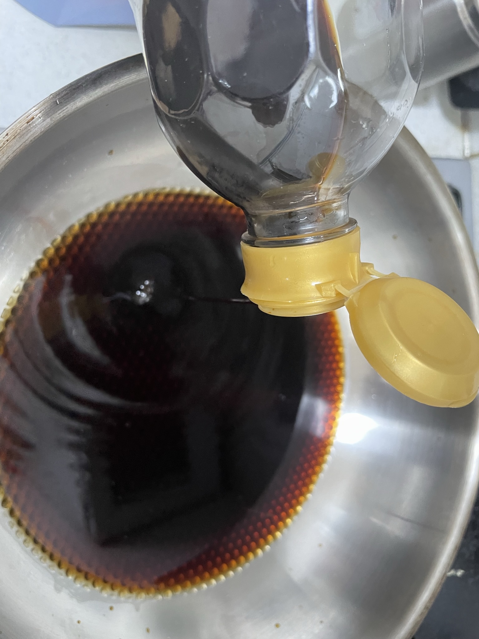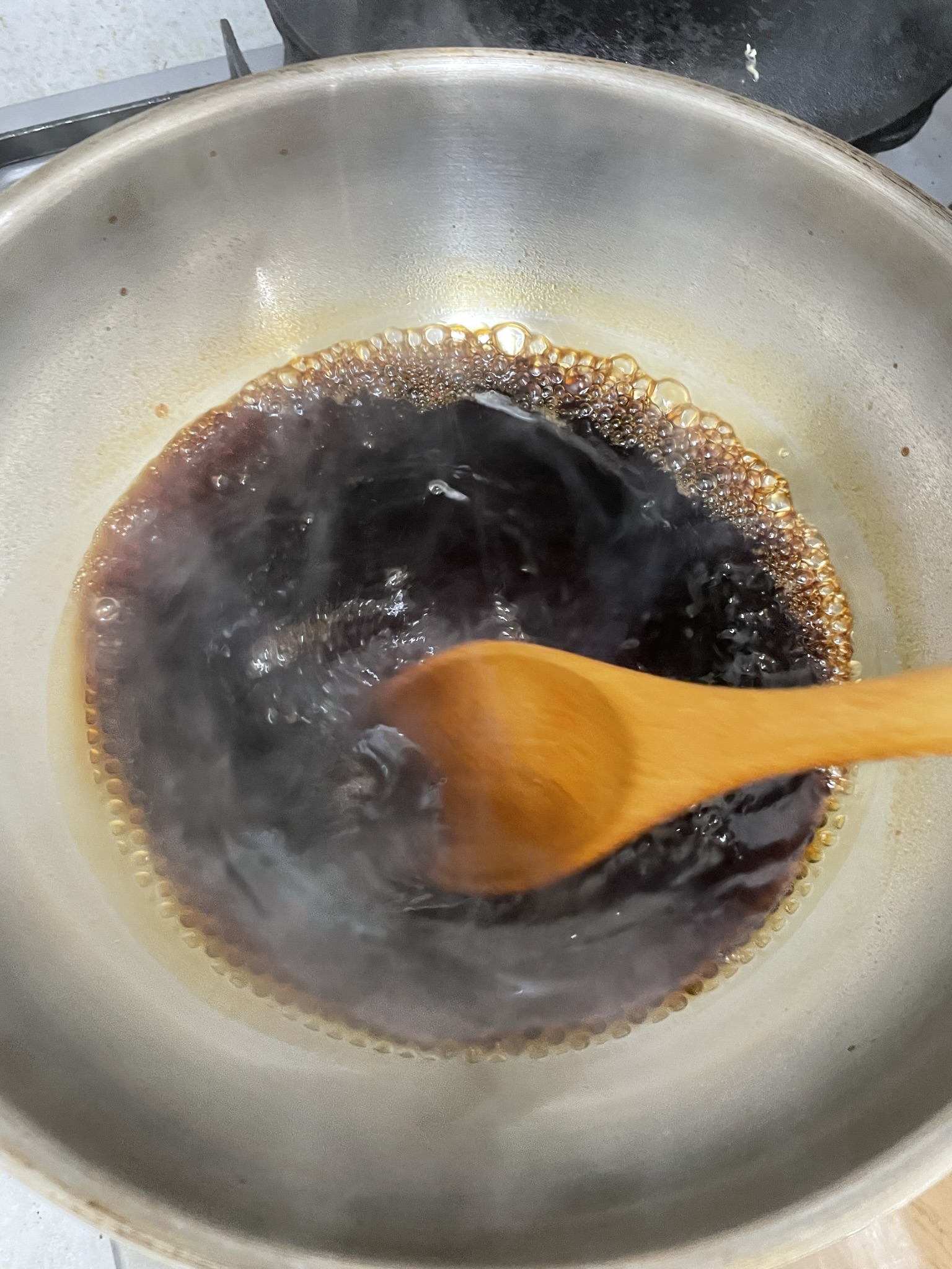 1. 물(1), 설탕(1), 간장(2/3)를 넣고 끓입니다.