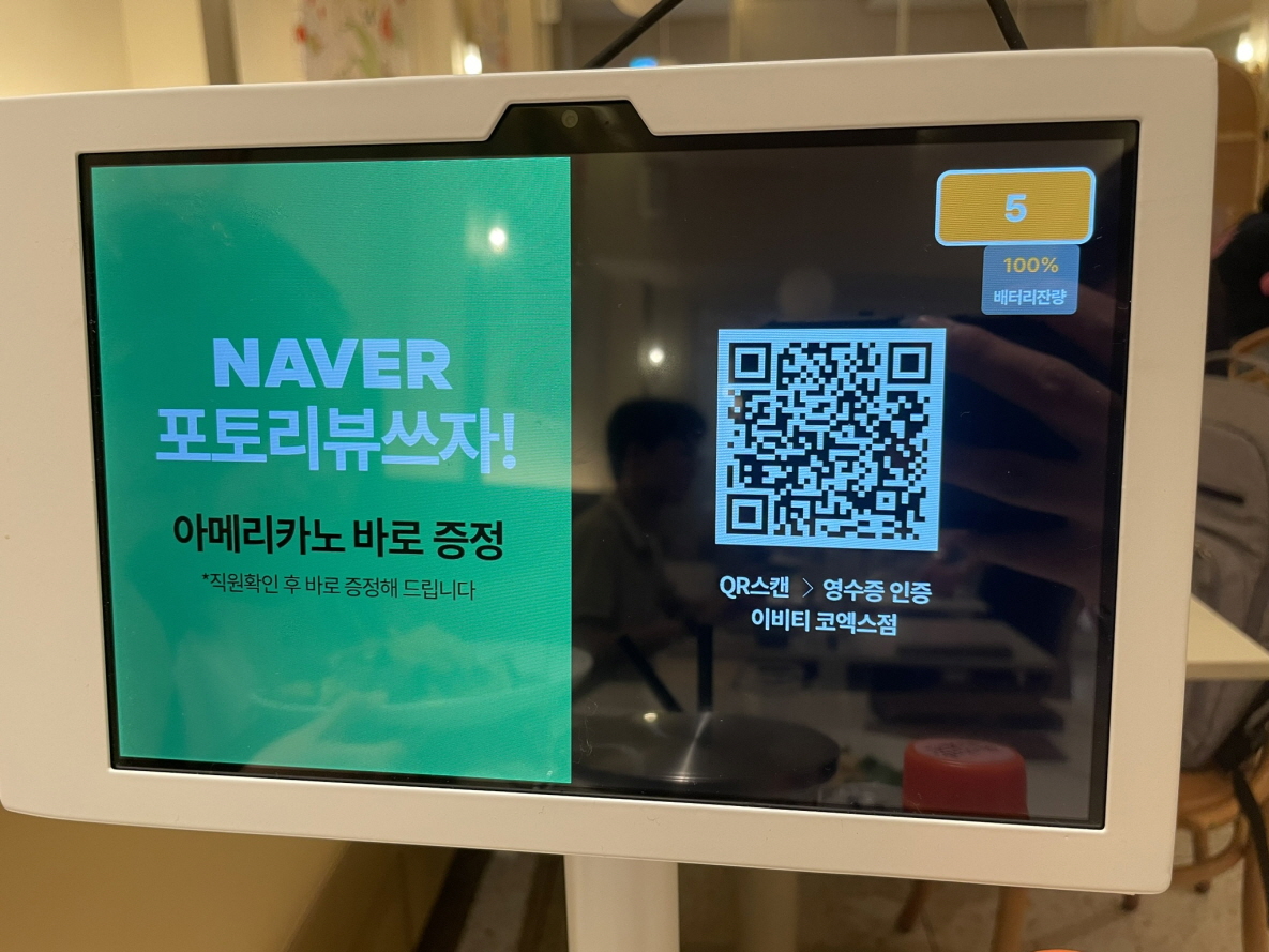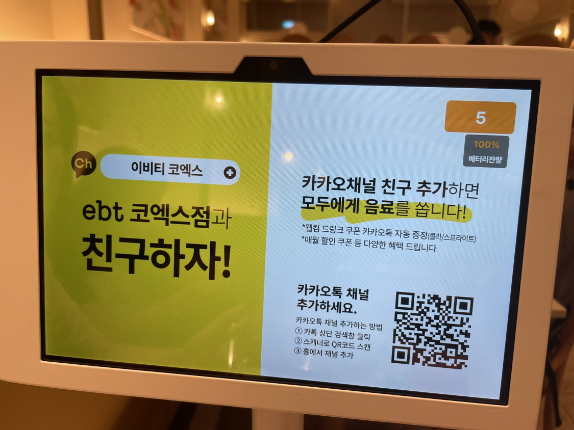 코엑스몰에 많은 음식점이 비슷한 이벤트음료를 주는데요. 여기도 카카오채널 친구추가하면 음료를 먹을 수 있어요. 자리마다 탄산음료가 있는 것을 볼 수 있어요. 따로 음료주문은 안 해도 되겠네요.