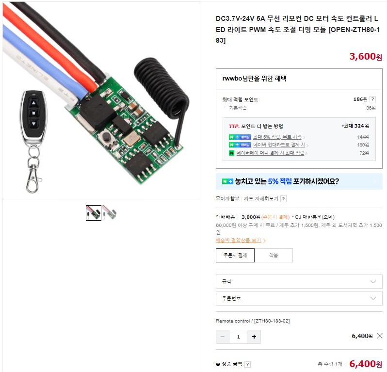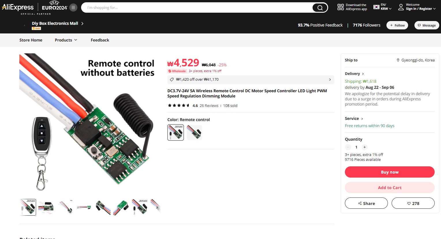 알리익스프레스 제품명: DC 3.7V-24V 5A Wireless Remote Control DC Motor Speed Controller LED Light PWM Speed Regulation Dimming Module with Remote