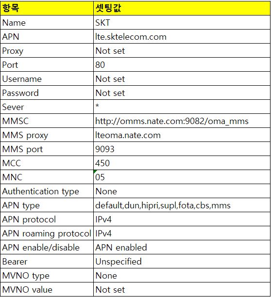 8 New APN에 나오는 각 항목별 셋팅 값은 아래 표 대로 설정하면 됩니다. SKT기준 설정입니다. 통신사가 다르면 APN설정값을 각 통신사에 맞게 해줘야 합니다.(입력 중 특수문자는 좌측 면 아래버튼 누르면 특수문자 입력 가능합니다.)