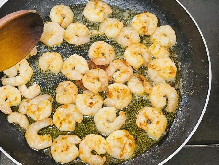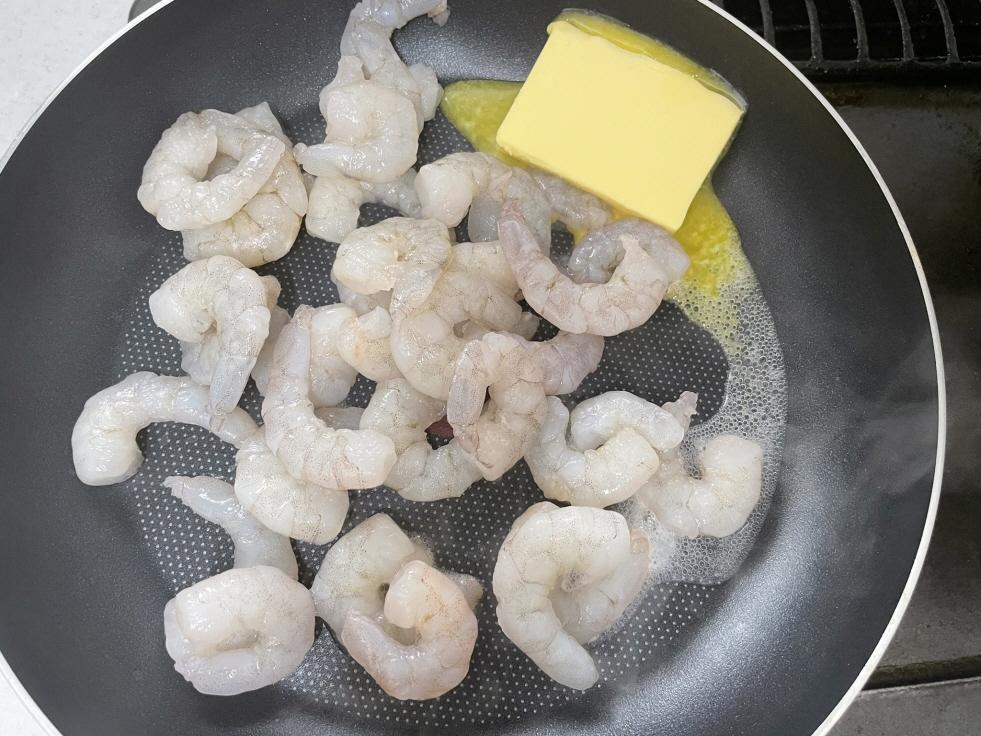 흰다리 새우살은 찬물에 헹군 후 프라이팬에 버터와 함께 볶습니다. 흰다리새우살은 꼬리 있는 새우가 보기 좋아요. 저는 그냥 냉동새우로 했어요. 소금과 후추로 간을 맞춥니다.