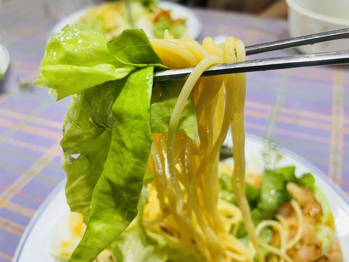 미리 만들어둔 소스를 스파게티와 샐러드에 뿌리면 완성입니다.