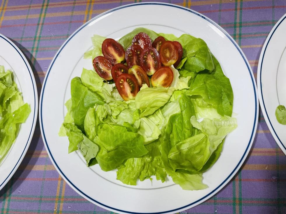 방울토마토를 반씩 잘라서 양상추위에 올려놓습니다.