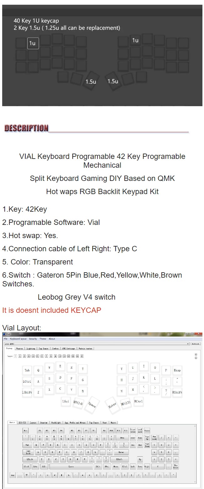 제품명: VIAL Keyboard Programable 42 Key Programable Mechanical Split Keyboard Gaming DIY Based on QMK Hot waps RGB Backlit Keypad Kit