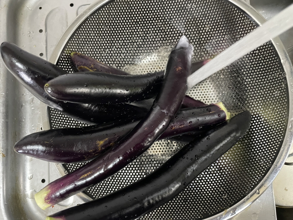 가지는 꼭지 부분을 잘라낸 후 덥혀있는 부분을 제거합니다.