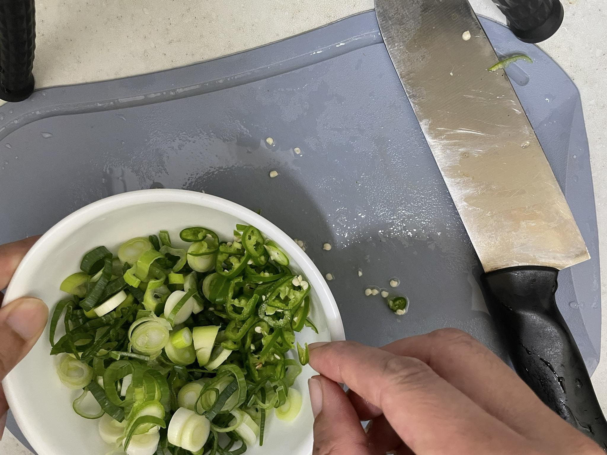 청양고추를 얇게 썰어서 대파와 섞어요.