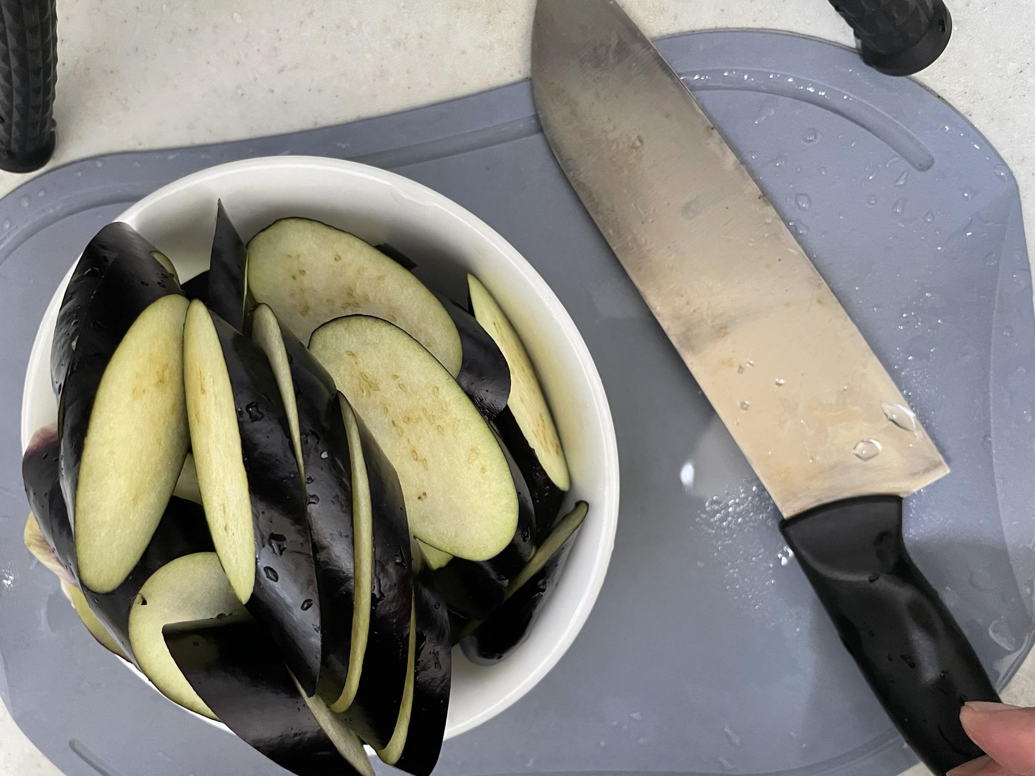 가지는 두껍고 길게 어슷 썰어 준비합니다. 가지가 익으면 두께가 얇아집니다. 조금 두껍게 썰어야 밥하고 먹을 때 맛있어요.