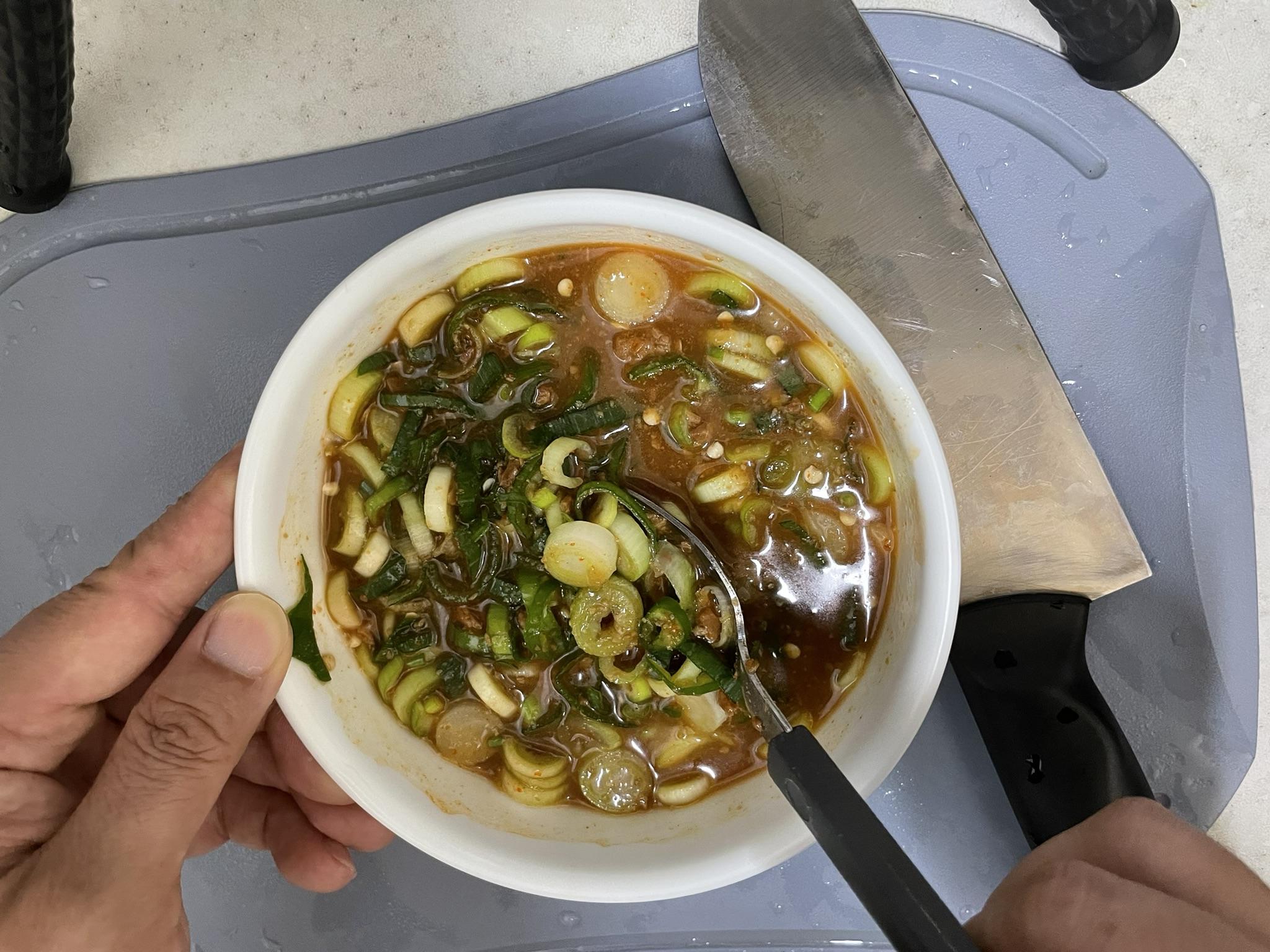 청양고추를 얇게 썰어서 대파와 섞어요.