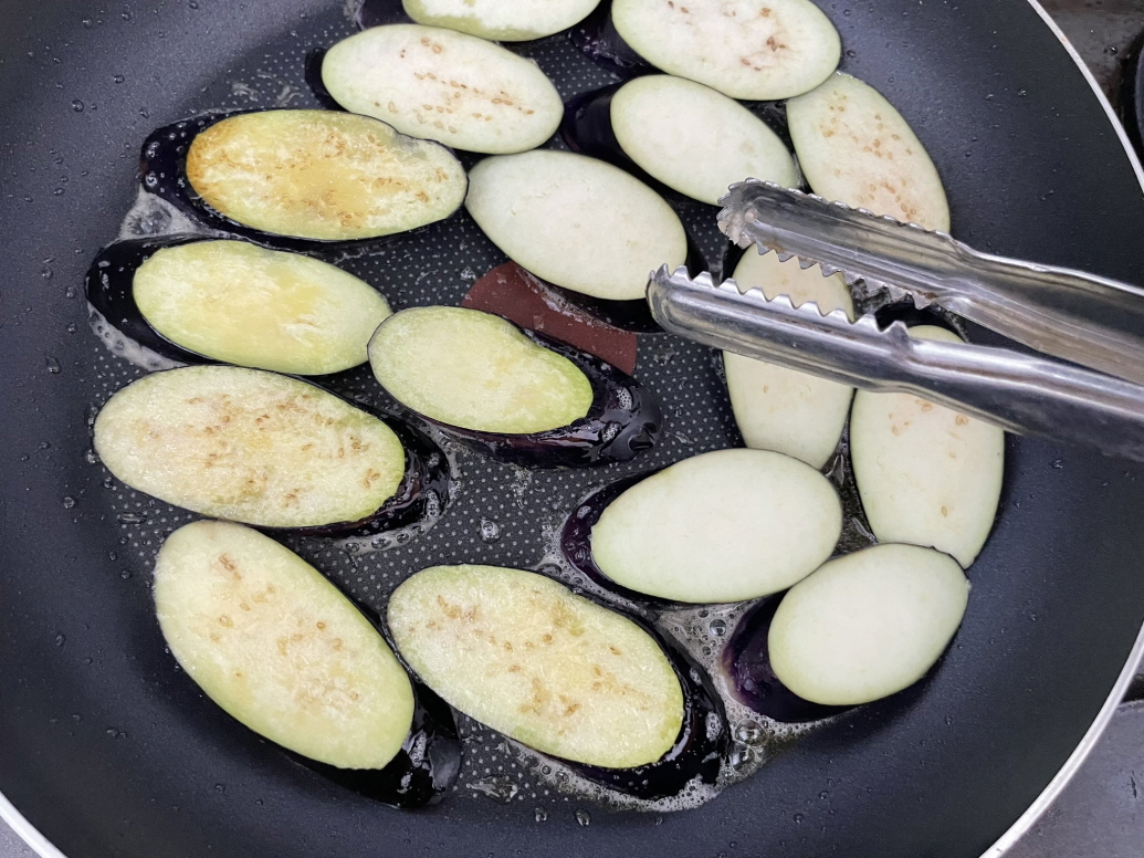 프라이팬에 식용유를 두르고 가지를 양쪽으로 뒤집으며 구워줍니다.