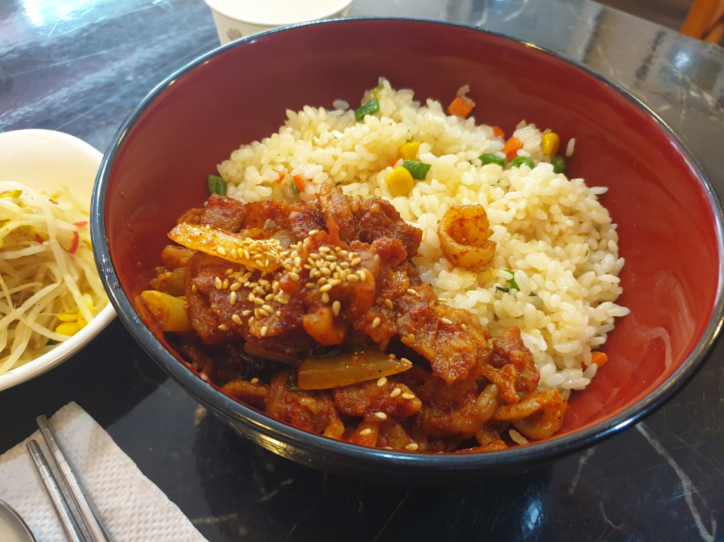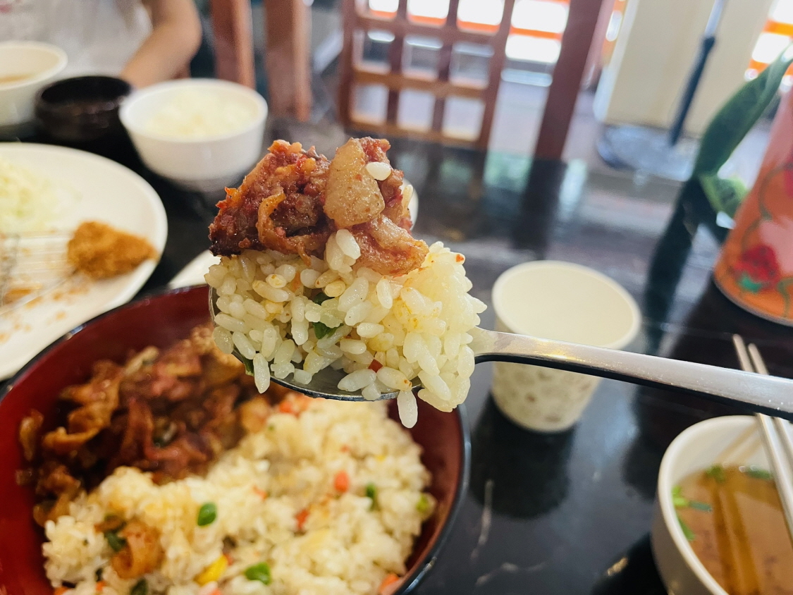 제육 볶음밥도 제주도 흑돼지로 만든 제육볶음 덮밥이네요. 베이스는 볶음밥이에요. 이집 볶음밥 맛은 마가린으로 볶았는지 고소하고 부드러운 맛이 나요.볶음밥과 제육볶음을 같이 떠먹으면 맛있어요.
