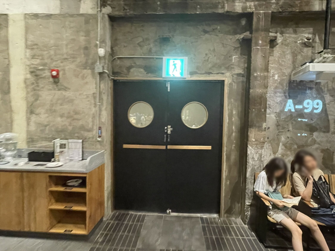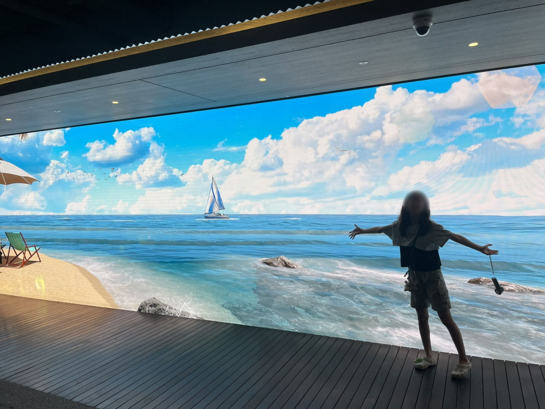 문을 열고 들어가면 시원한 에어컨 공기와 함께 대형 사이니지 화면에 파도치는 바다가 나타나요.