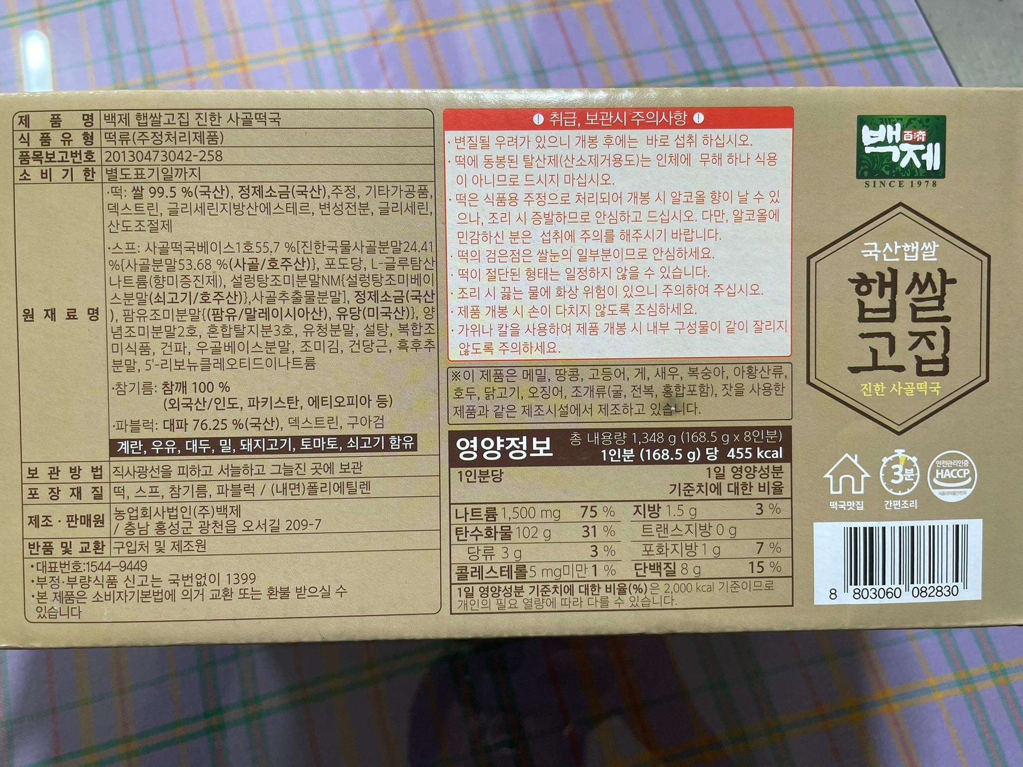 1인분의 내용물은 떡과 스프, 파블럭, 참기름 이렇게 4가지 입니다.