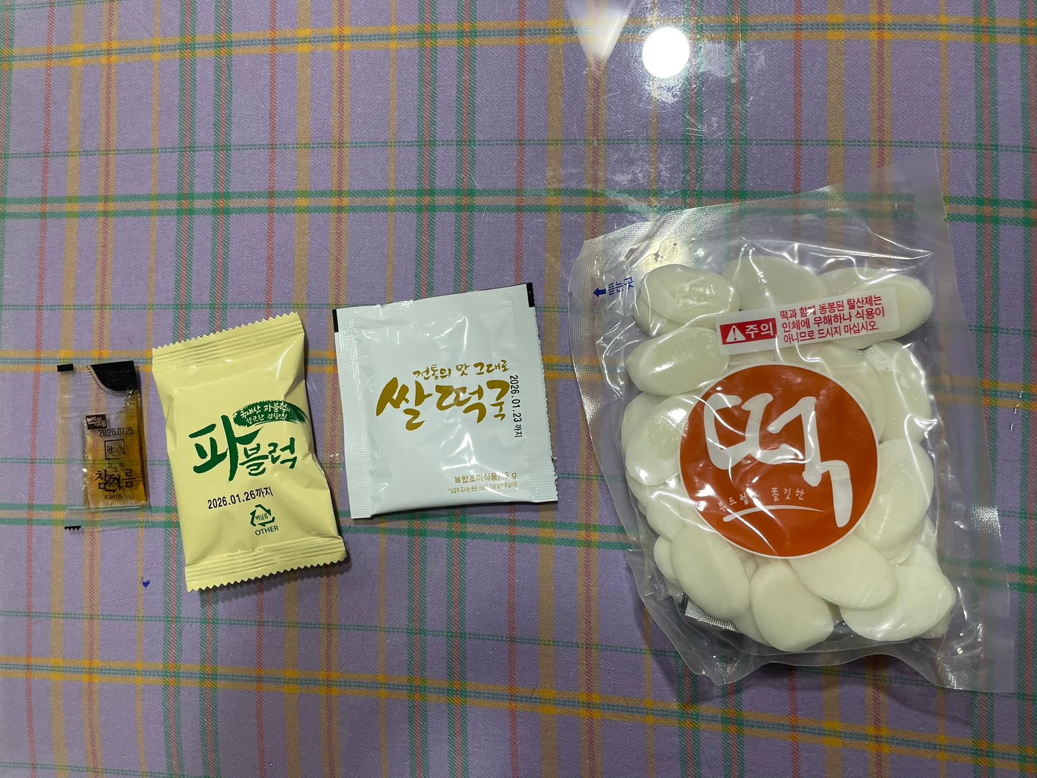 1인분의 내용물은 떡과 스프, 파블럭, 참기름 이렇게 4가지 입니다.