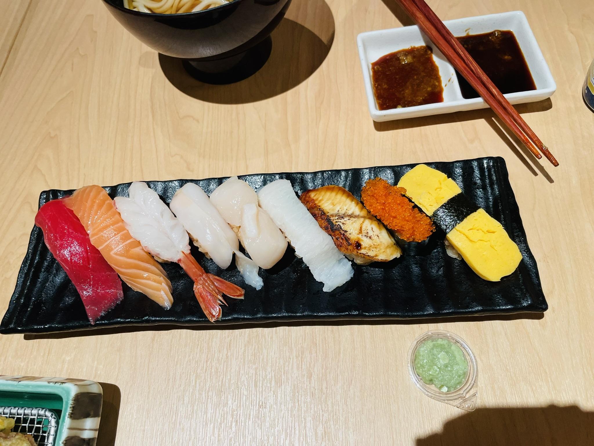 초밥은 보통 이상의 맛이에요. 우리나라 초밥 맛집 정도의 맛은 내는 것 같아요. 한 가지 이상했던 건 초밥의 밥색깔이 흰색이 아니고 조금 갈색이에요. 전복내장을 넣은 느낌 이랄까요. 밥 맛의 차이는 크게 못 느꼈습니다.