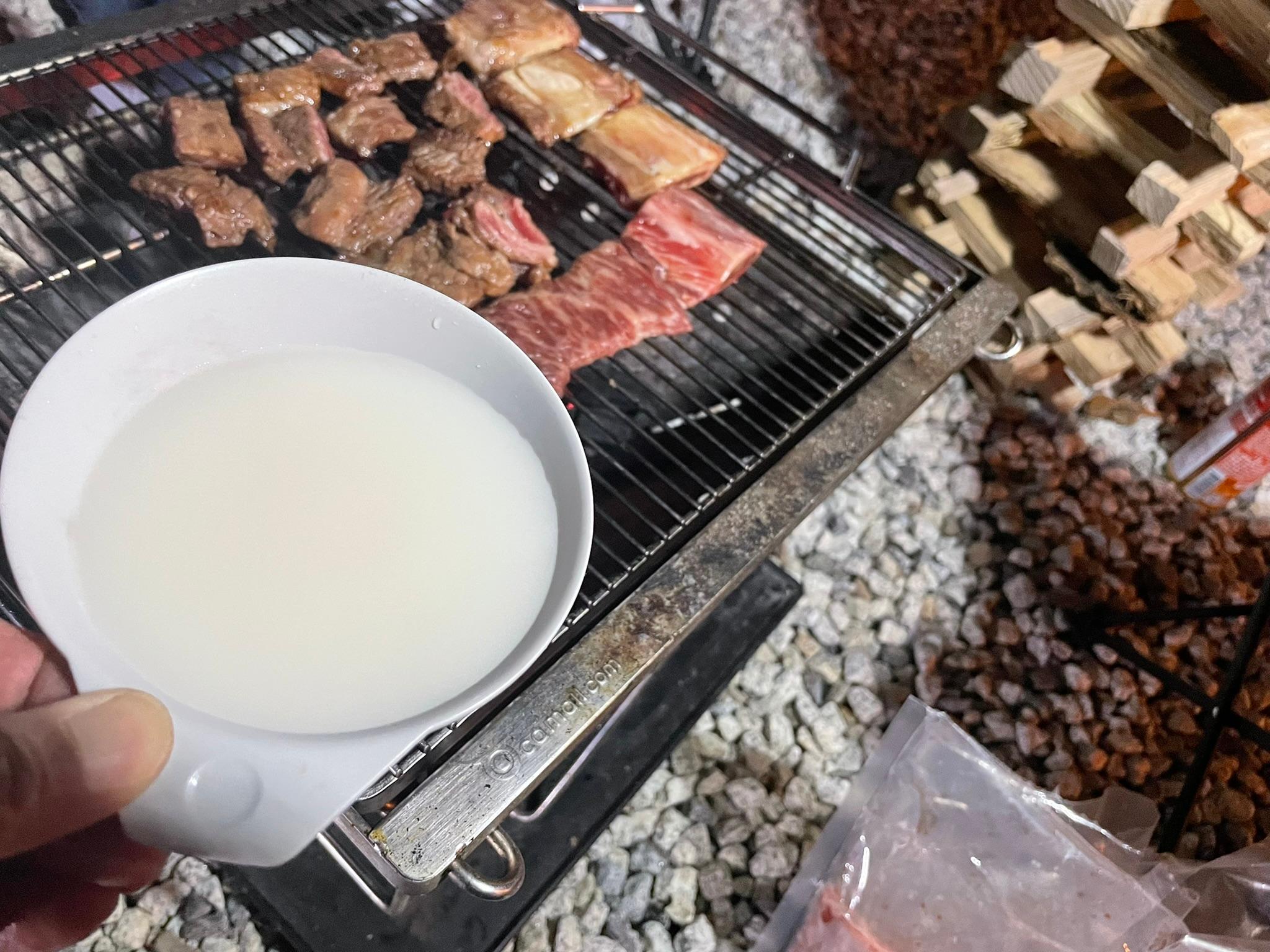 숯불에 고기를 올려놓고 막걸리 한잔 마시니 힘들었던 피로가 싹 가시는 느낌이네요.