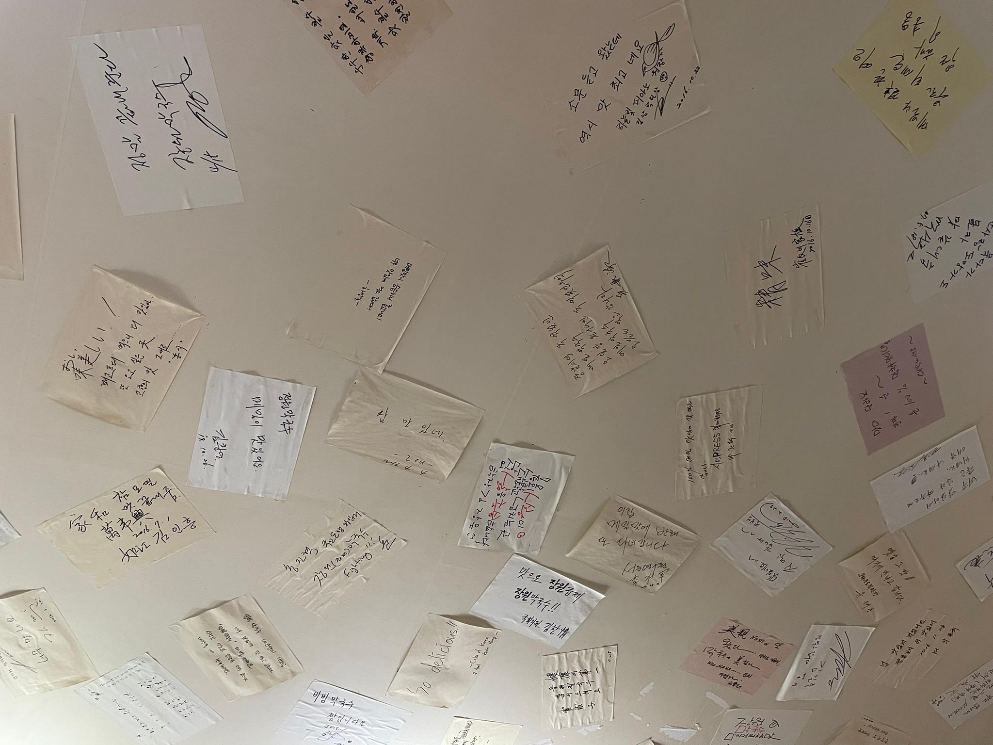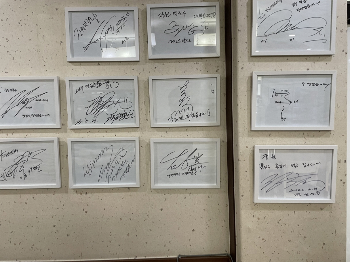 음식이 나올 때까지 기다리며 식당 내부를 둘러봤는데 특이하게 천장에도 방문했던 유명인의 친필 사인지가 붙어있네요. 벽에도 있는데 너무 많아서 천장에 붙인 거 같아요. 재미 있네요. 고개 들고 천장을 처다 보게 돼요.