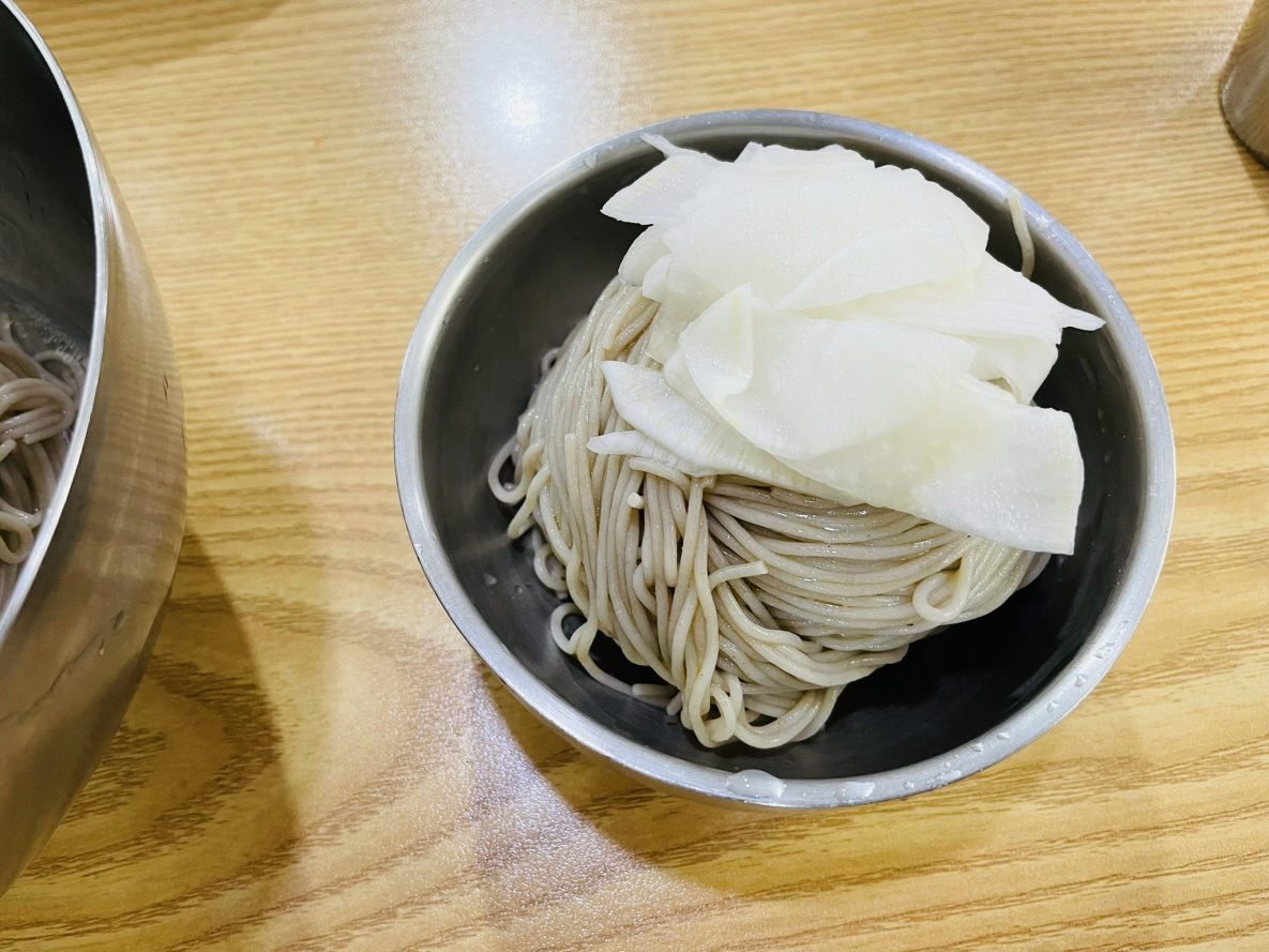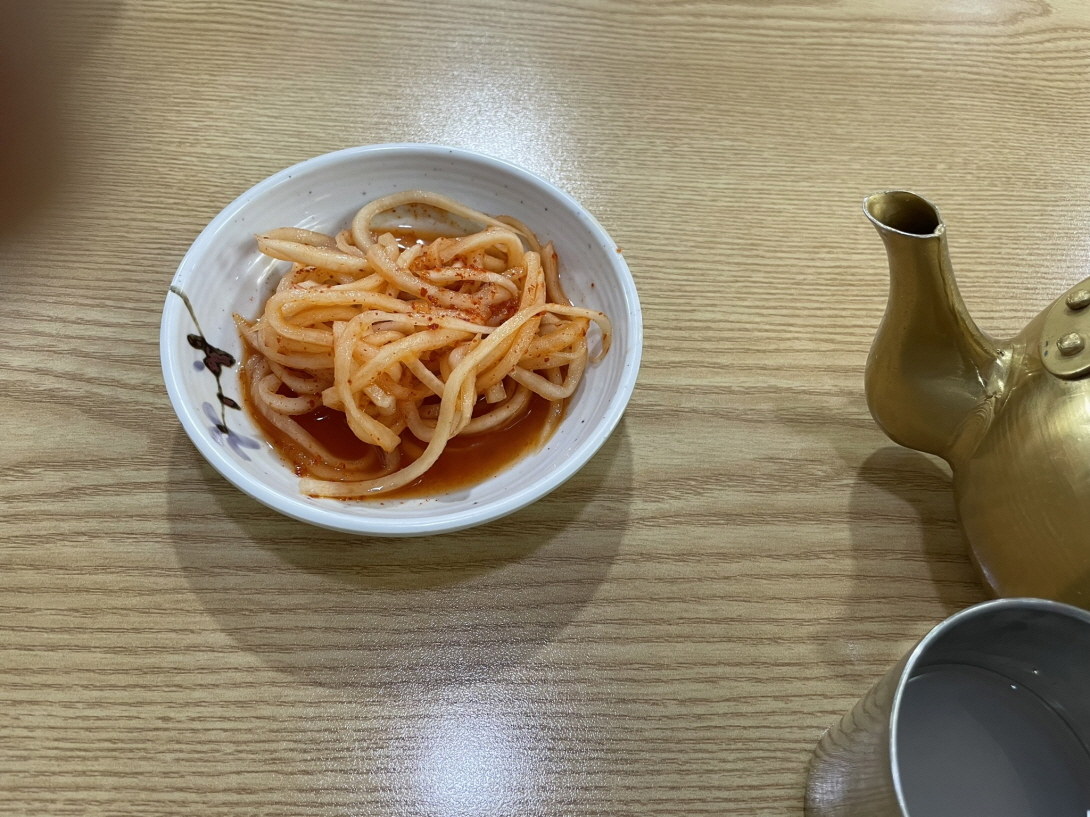 반찬은 무채 무침인데요. 개운한 맛이에요. 막국수와 잘 어울리는 맛입니다.