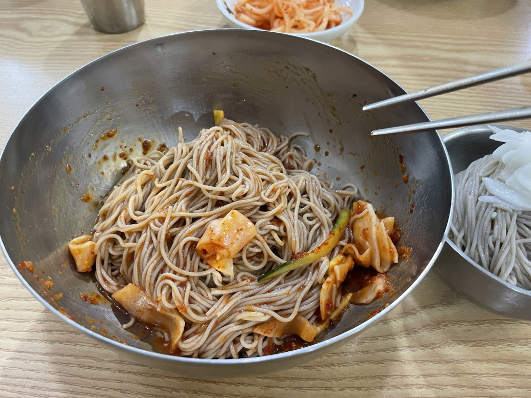 비빔막국수는 기대했던 그 맛입니다. 메뉴 모두 곱빼기는 없어요. 사리추가 주문해야 합니다. 비빔막국수 사리를 추가하고 양념장이 모자라면 테이블마다 있는 다진 양념을 넣으면 돼요.