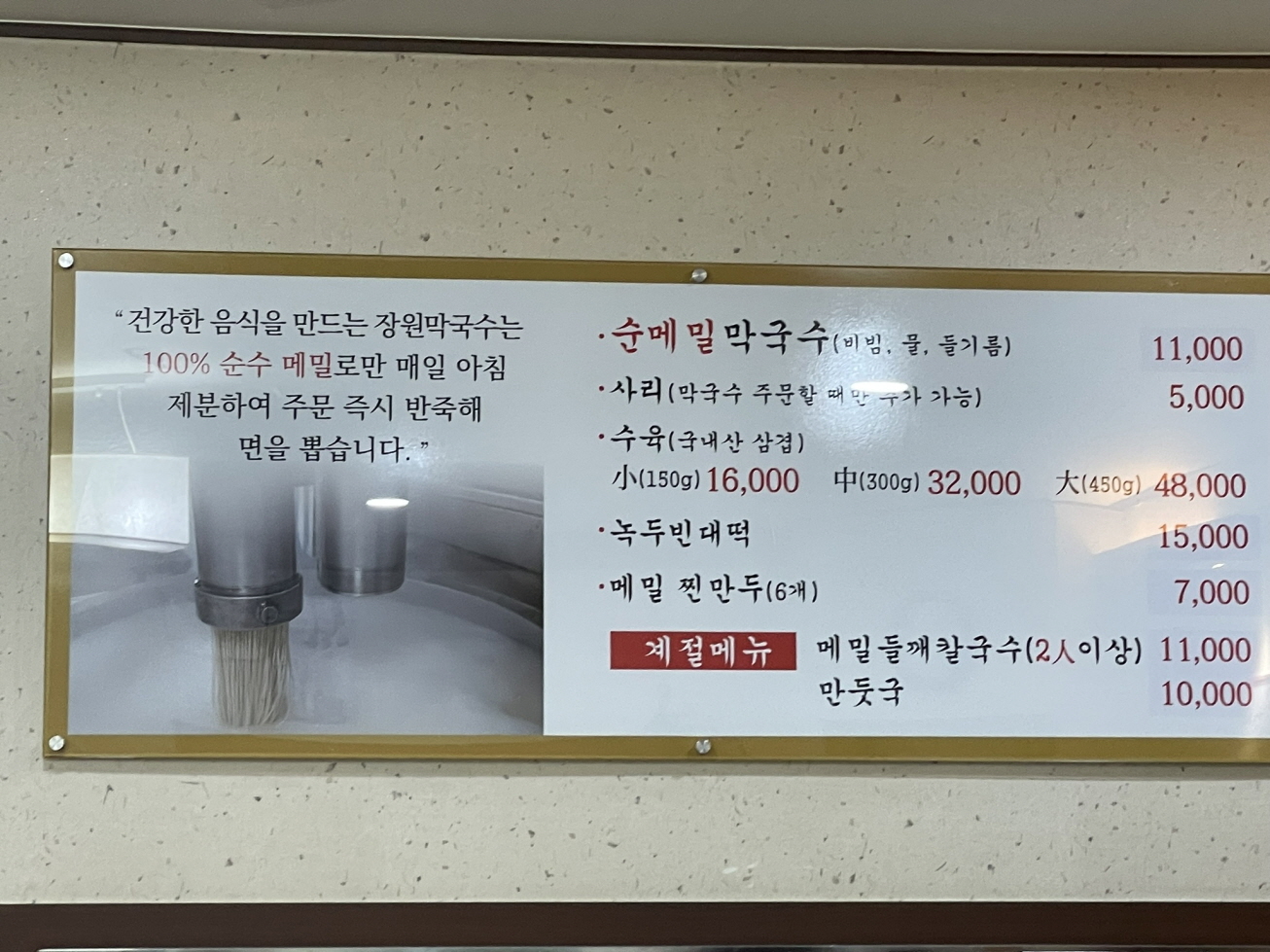 주 메뉴는 막국수인데 물, 비빔, 들기름 세 가지 맛이 있어요.