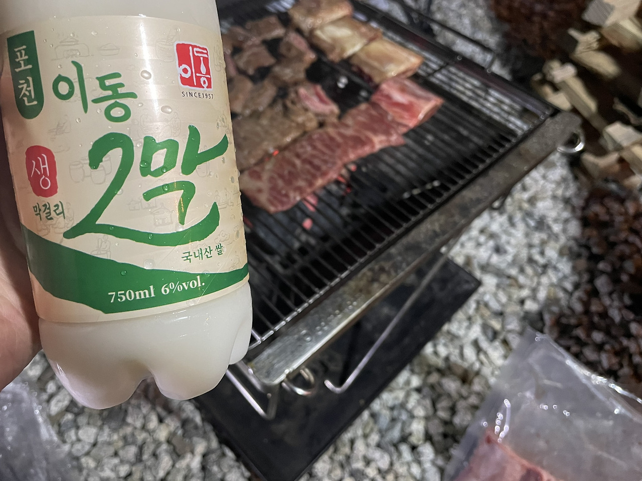 포천으로 캠핑을 가는 길에 이동 갈비와 이동 막걸리를 사가지고 갔어요.포천에 갔으니 이동 갈비와 이동 막걸리는 먹어야겠죠?캠핑장에서 구워 먹는 이동 갈비와 막걸리는 정말 꿀맛이네요.